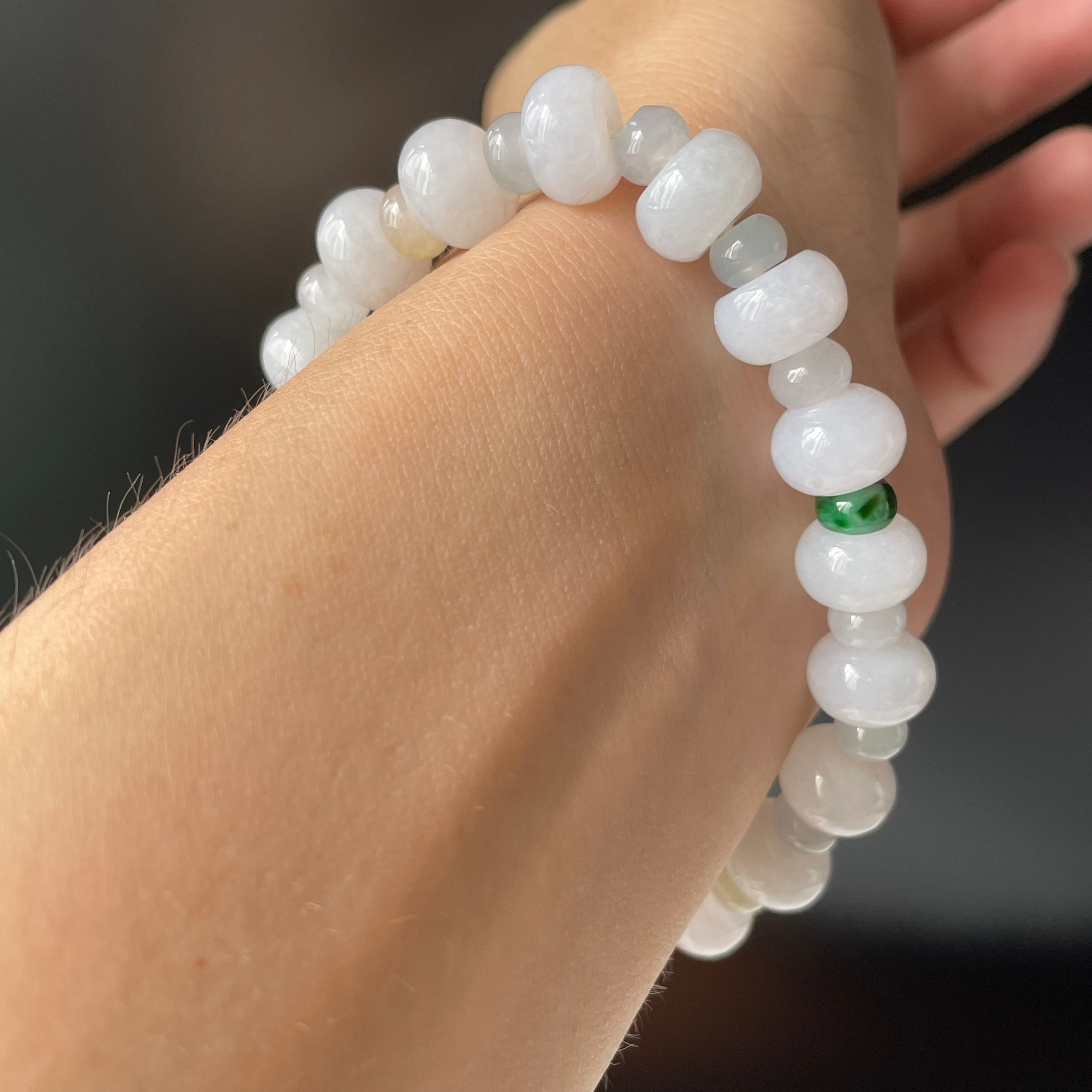 This GRADE A Jadeite Jade Bead Bracelet is Free of Treatment from Artificial coloring/ bleaching. The beads shape are curved to the unique shape of donut/bread instead of common round shape. It occupies consistent white for every big jade beads. 18 pieces of beautiful jade beads are threaded on elastic string with icy spacer beads which enhance the beauty of main big beads. This bracelet is unique, clean and occupies the vitreous luster. The beads have no cracks or chips.