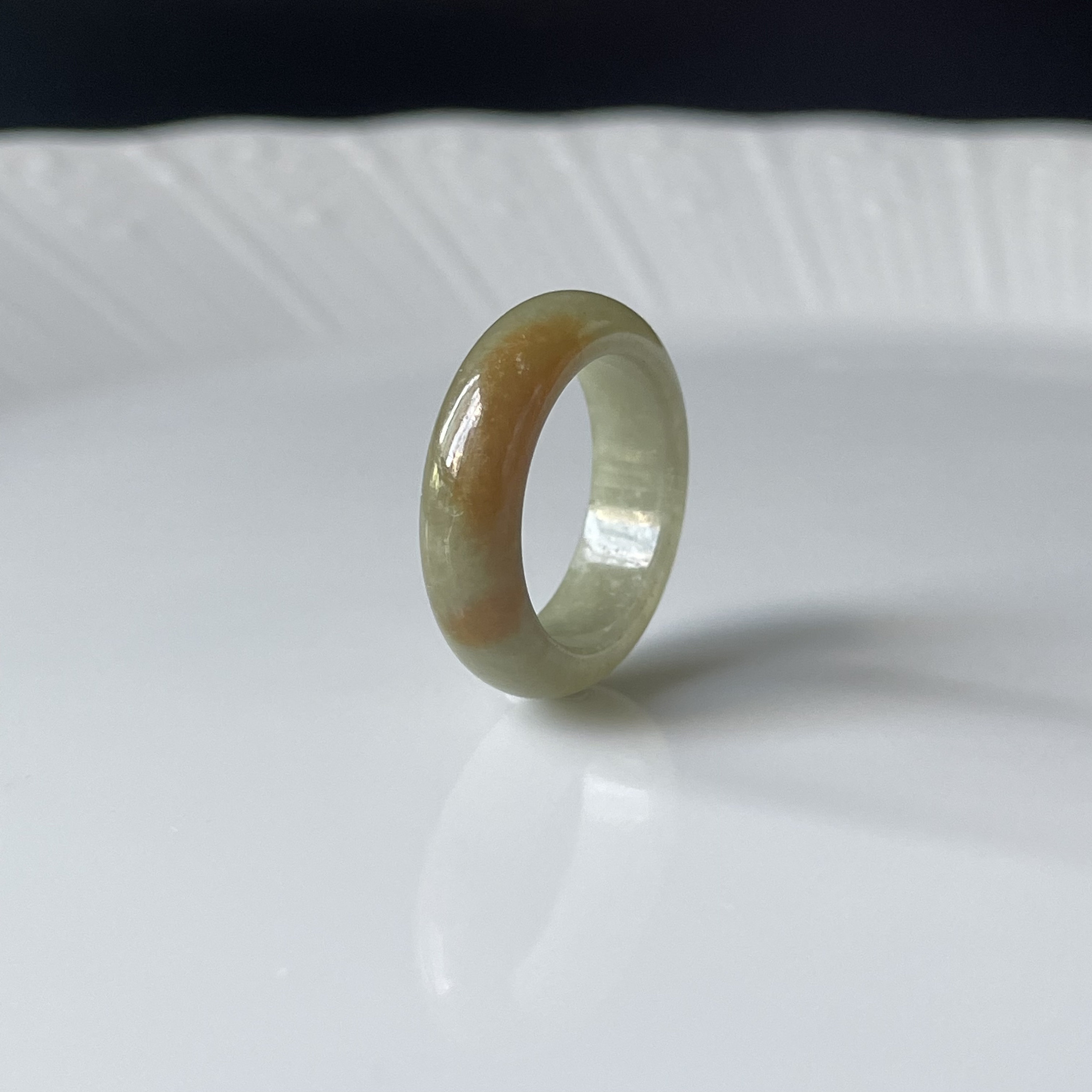 β’ This jadeite Ring is made with 100% Natural Myanmar jadeite. It was carved as the round smooth outer face and flat interface for comfort wear. The major 2 color light green and brownish yellow green are gradually mixed in water transition pattern along the band.