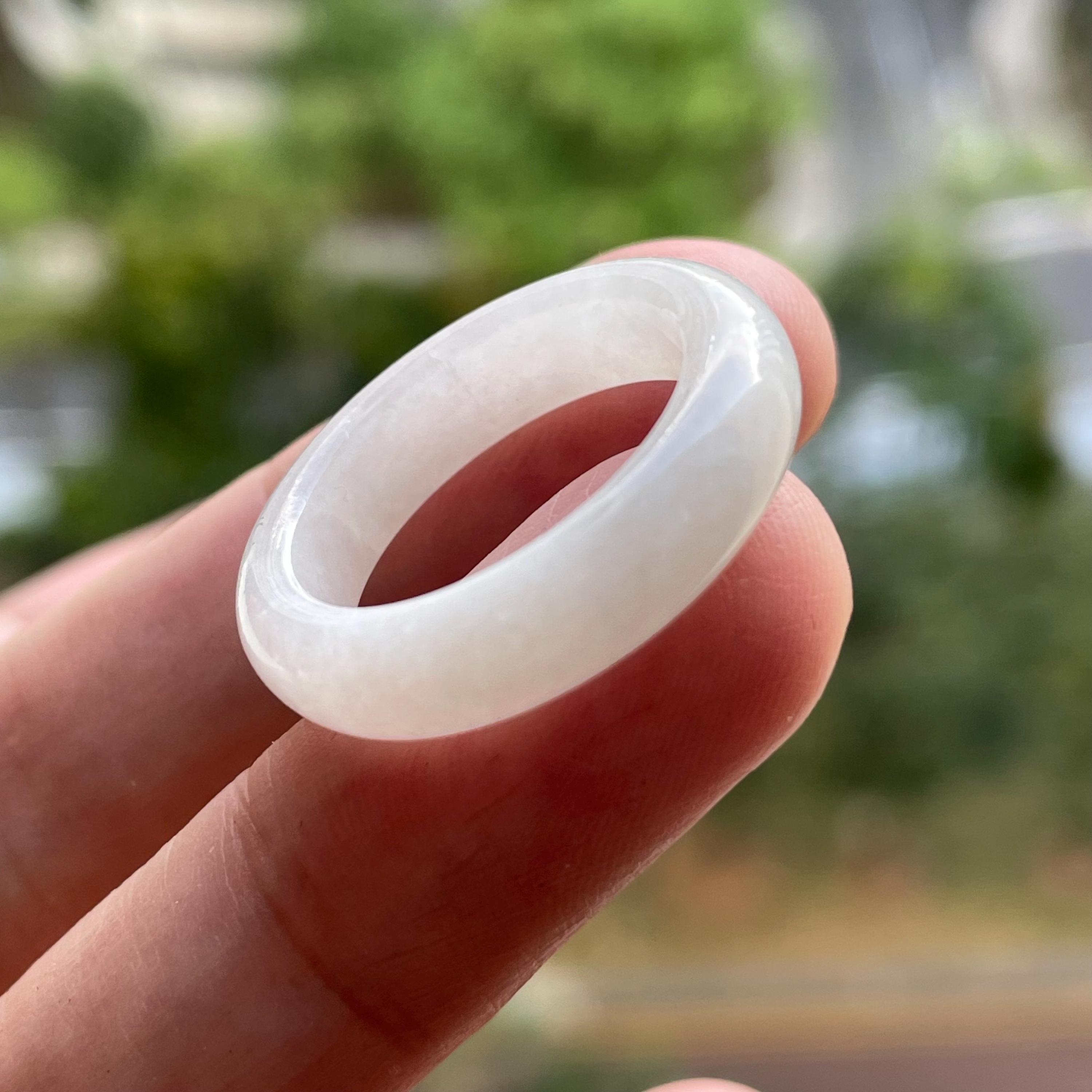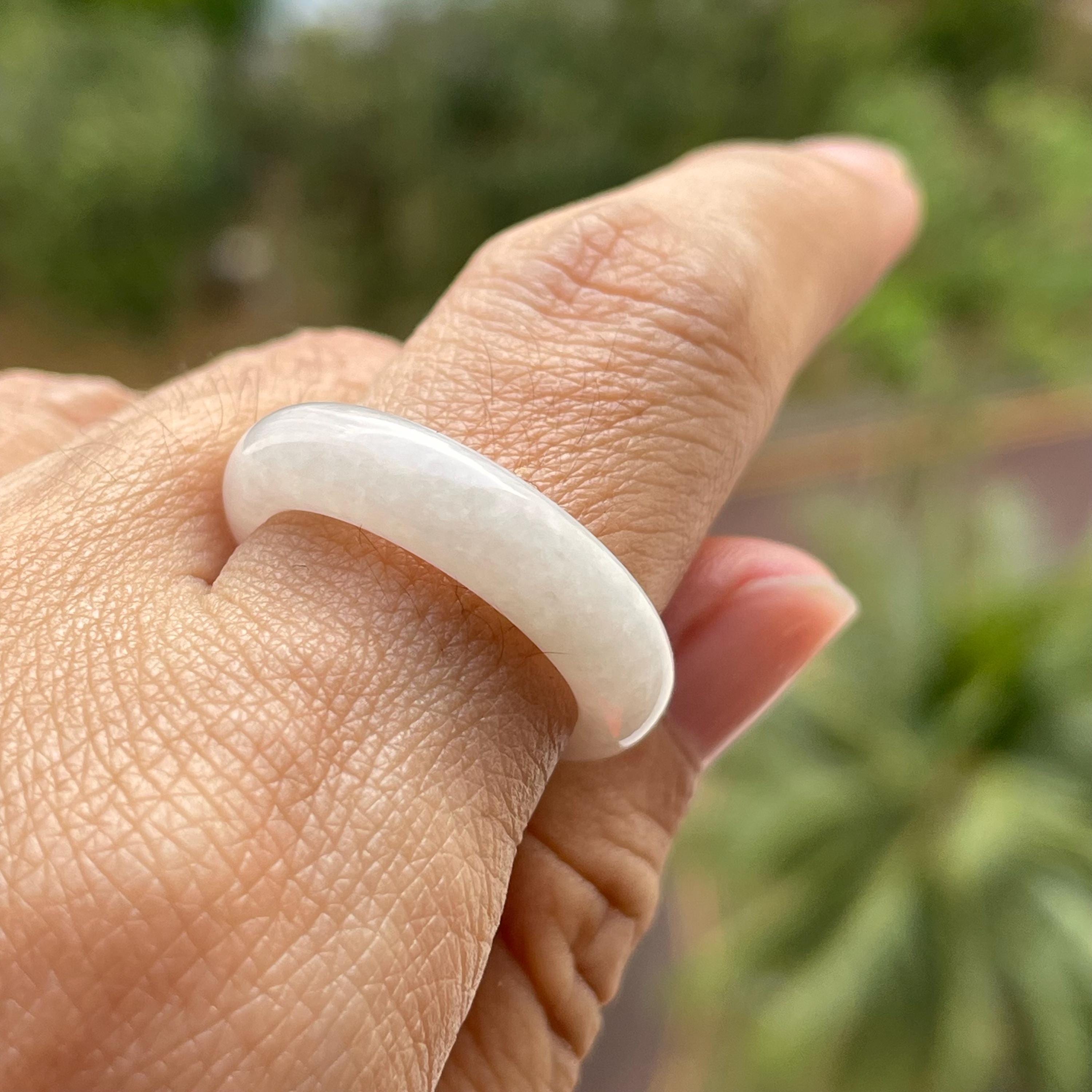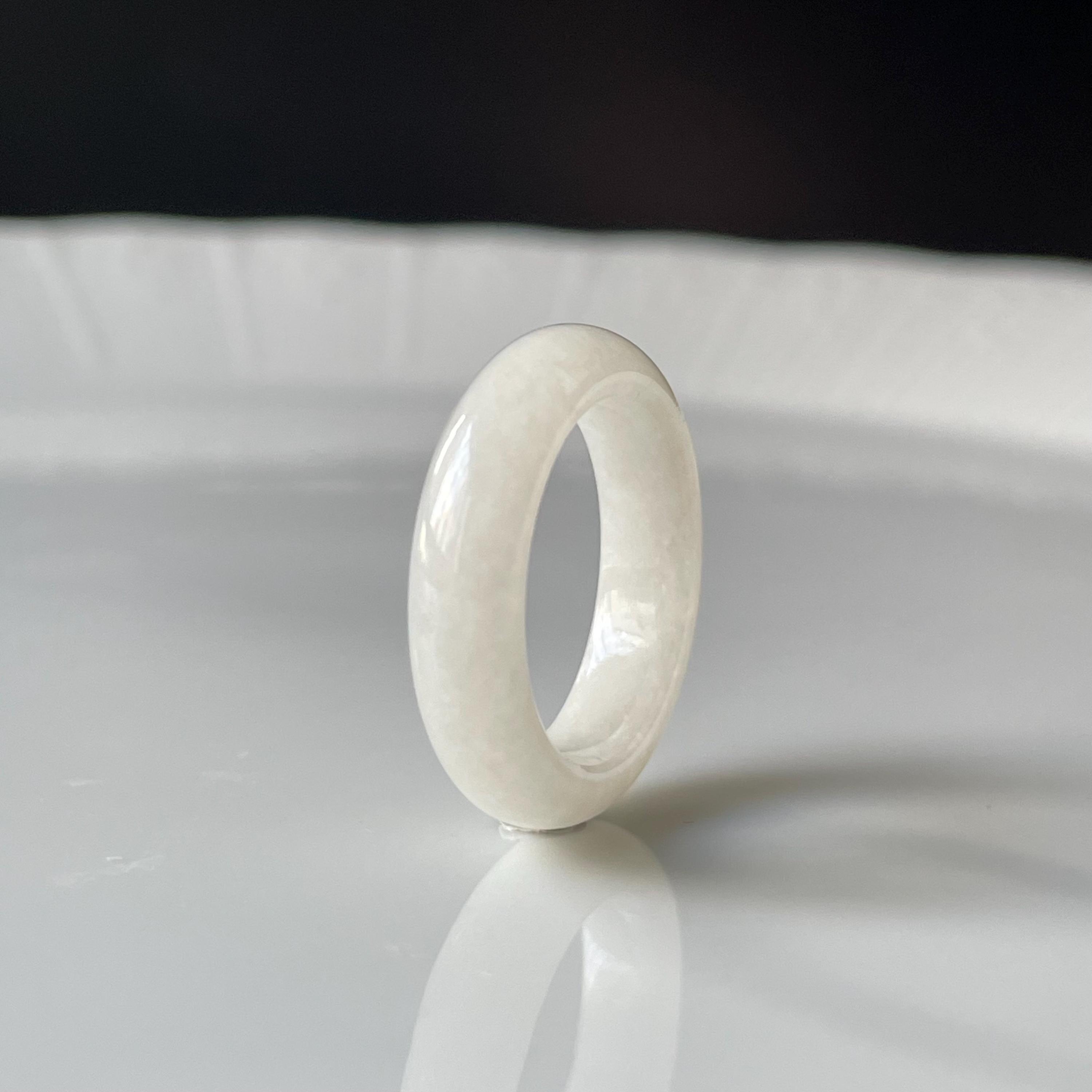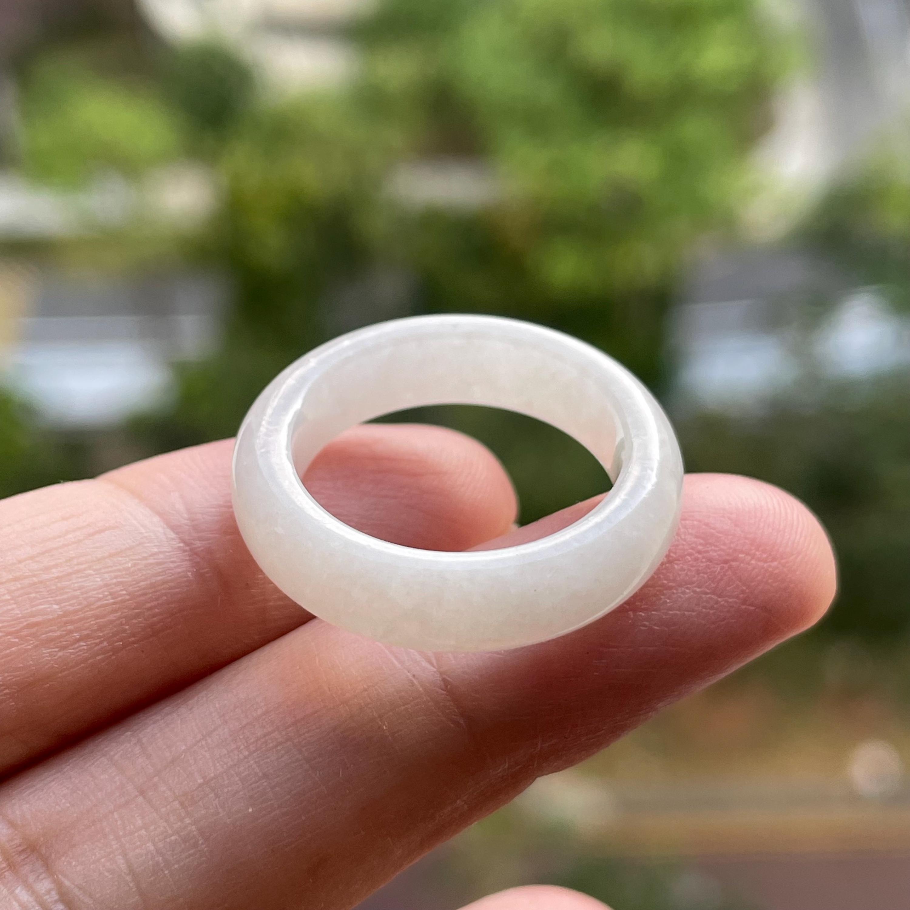 • The ring is hand carved from natural Burmese jadeite Boulder. It is neither treated nor bleached jade, moreover the color is natural and there is no chemical infilling thus this ring is categorized under Authentic Type A (Grade A) Jadeite. The main color is white for entire band with translucency.