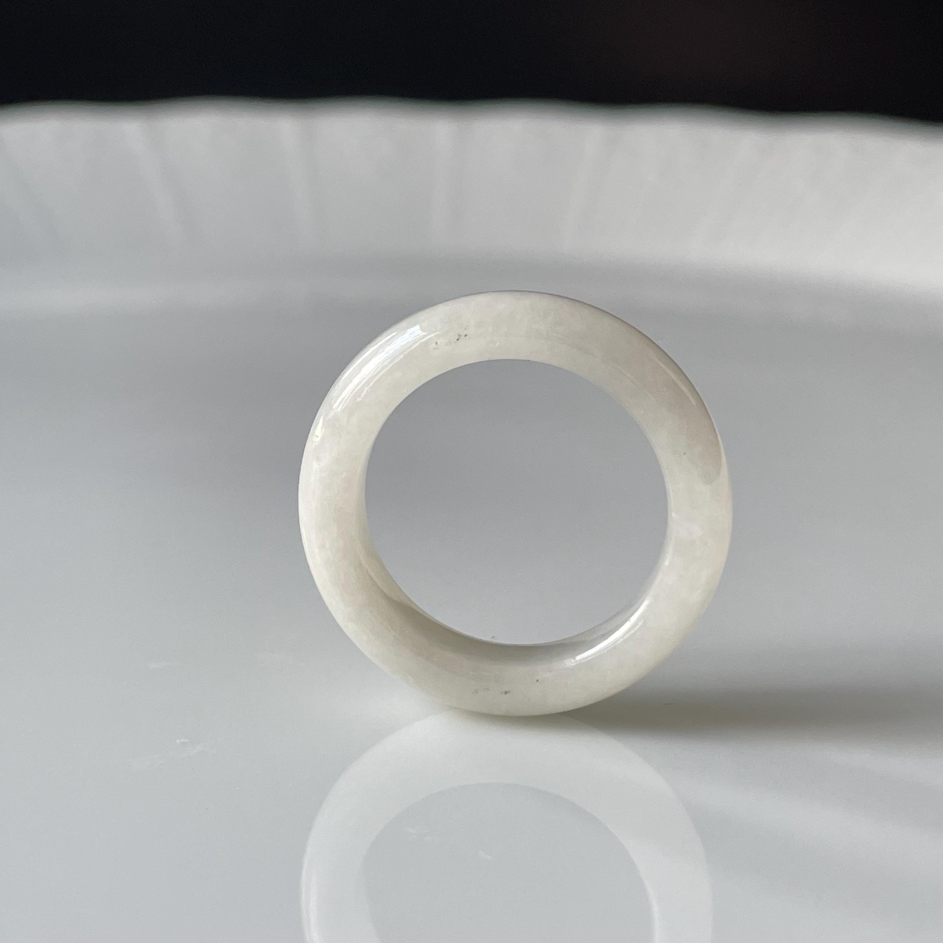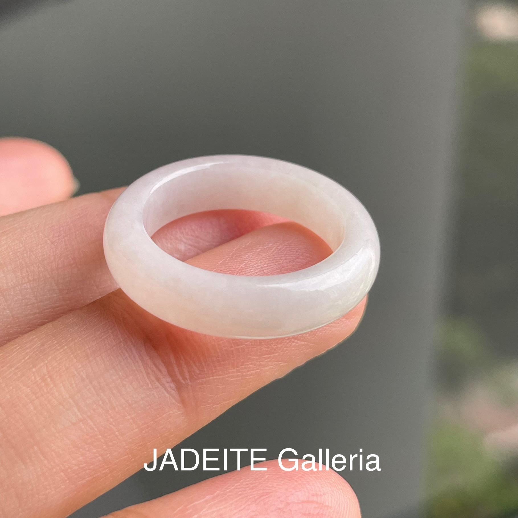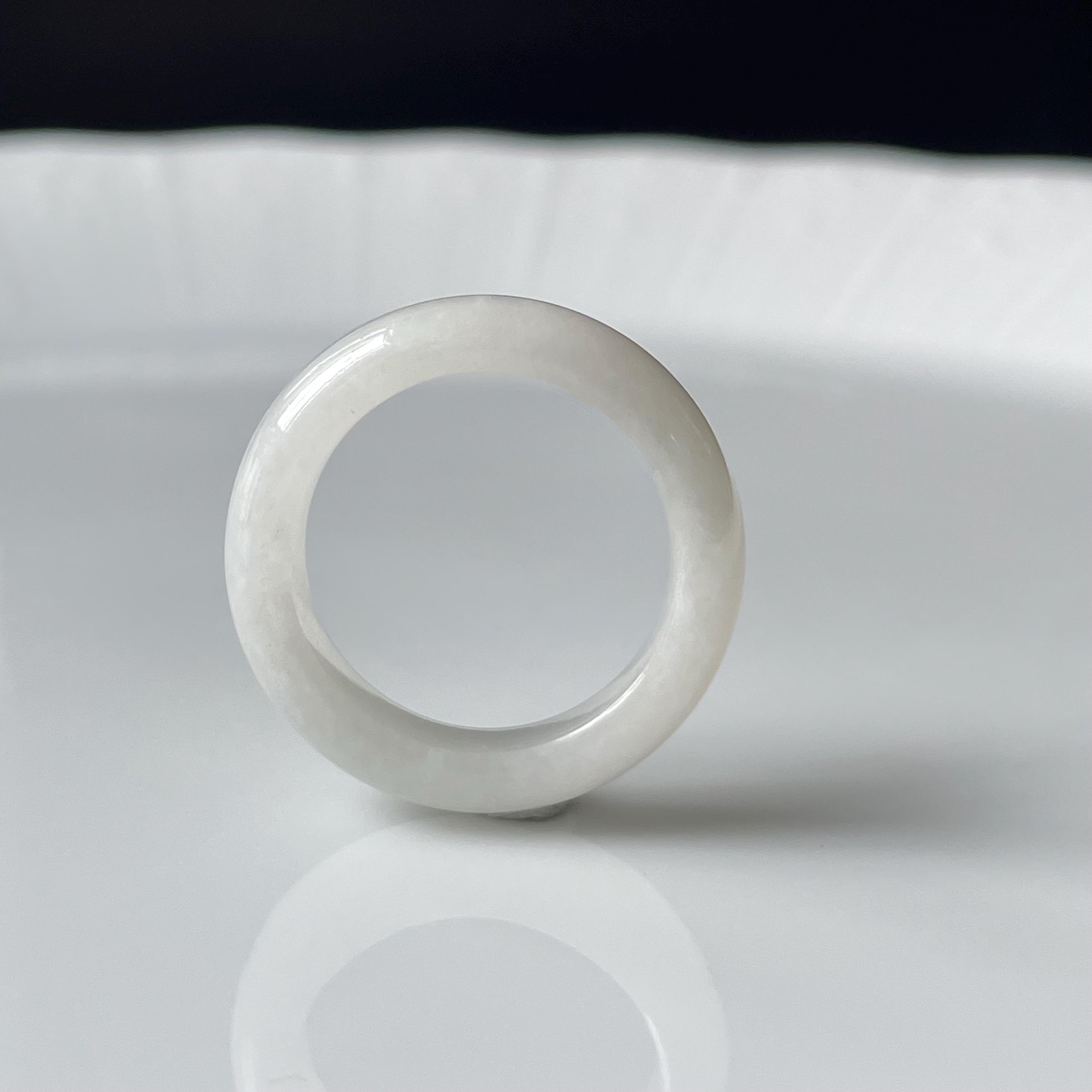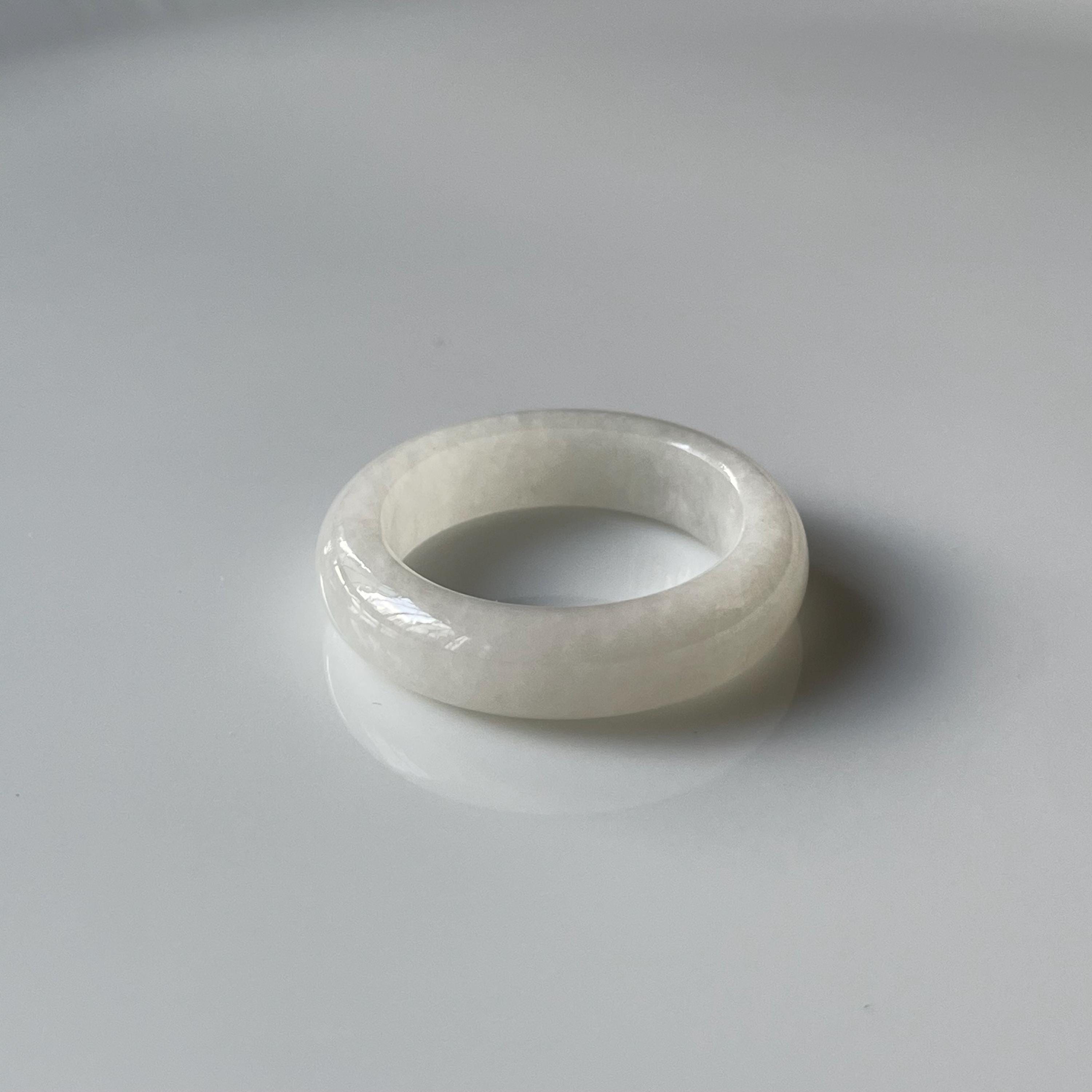 • The ring is hand carved from natural Burmese jadeite Boulder. It is neither treated nor bleached jade, moreover the color is natural and there is no chemical infilling thus this ring is categorized under Authentic Type A (Grade A) Jadeite. The main color is white for entire band with translucency.