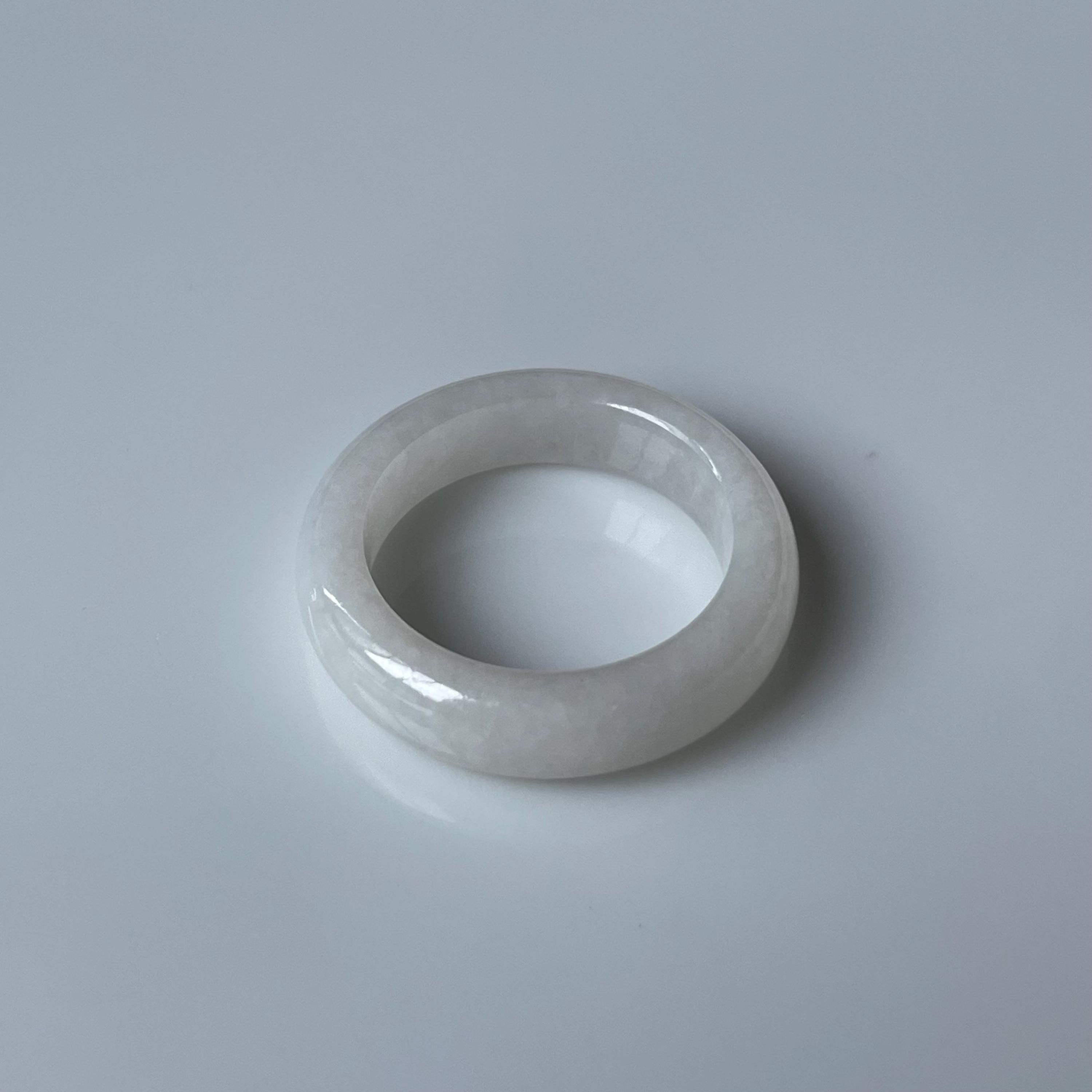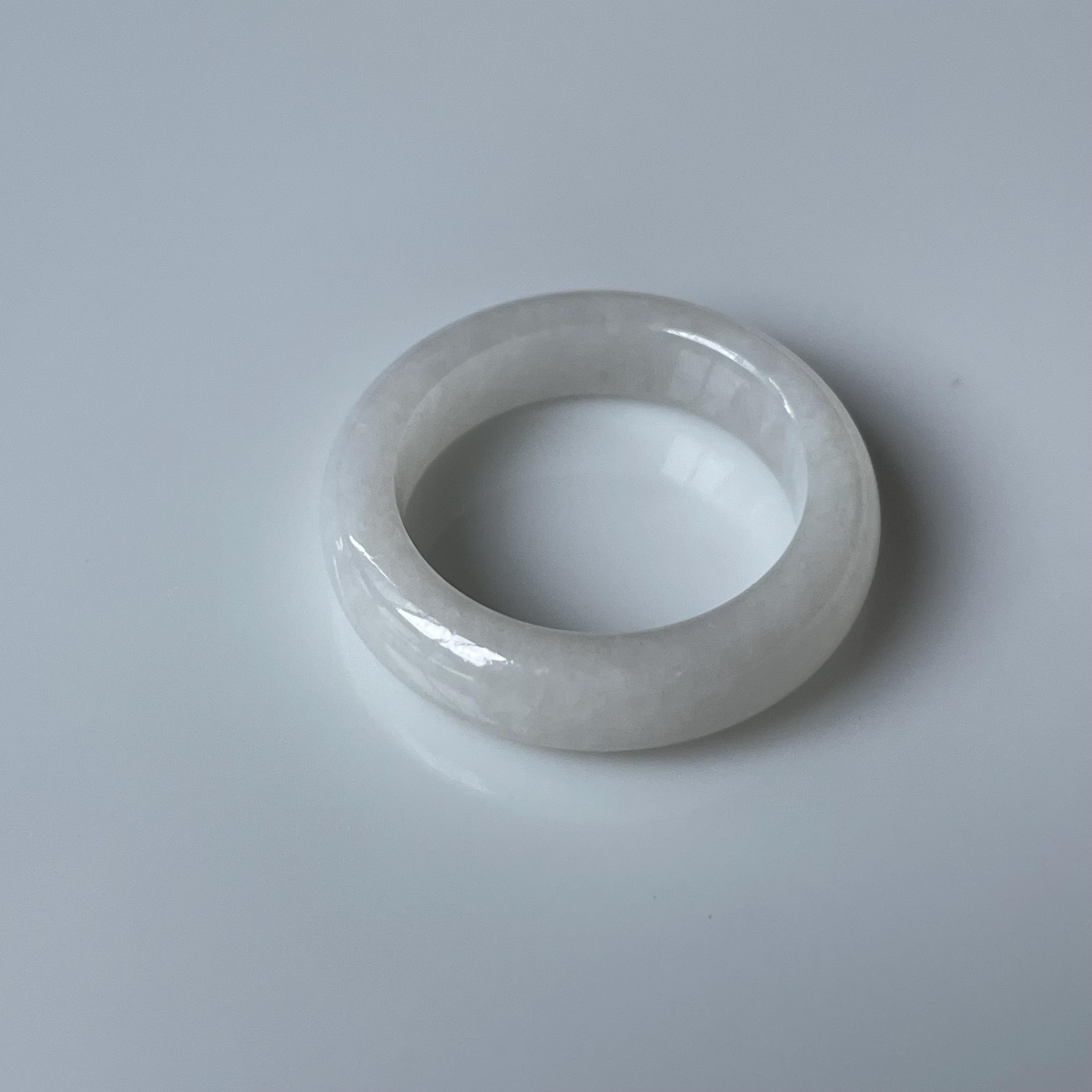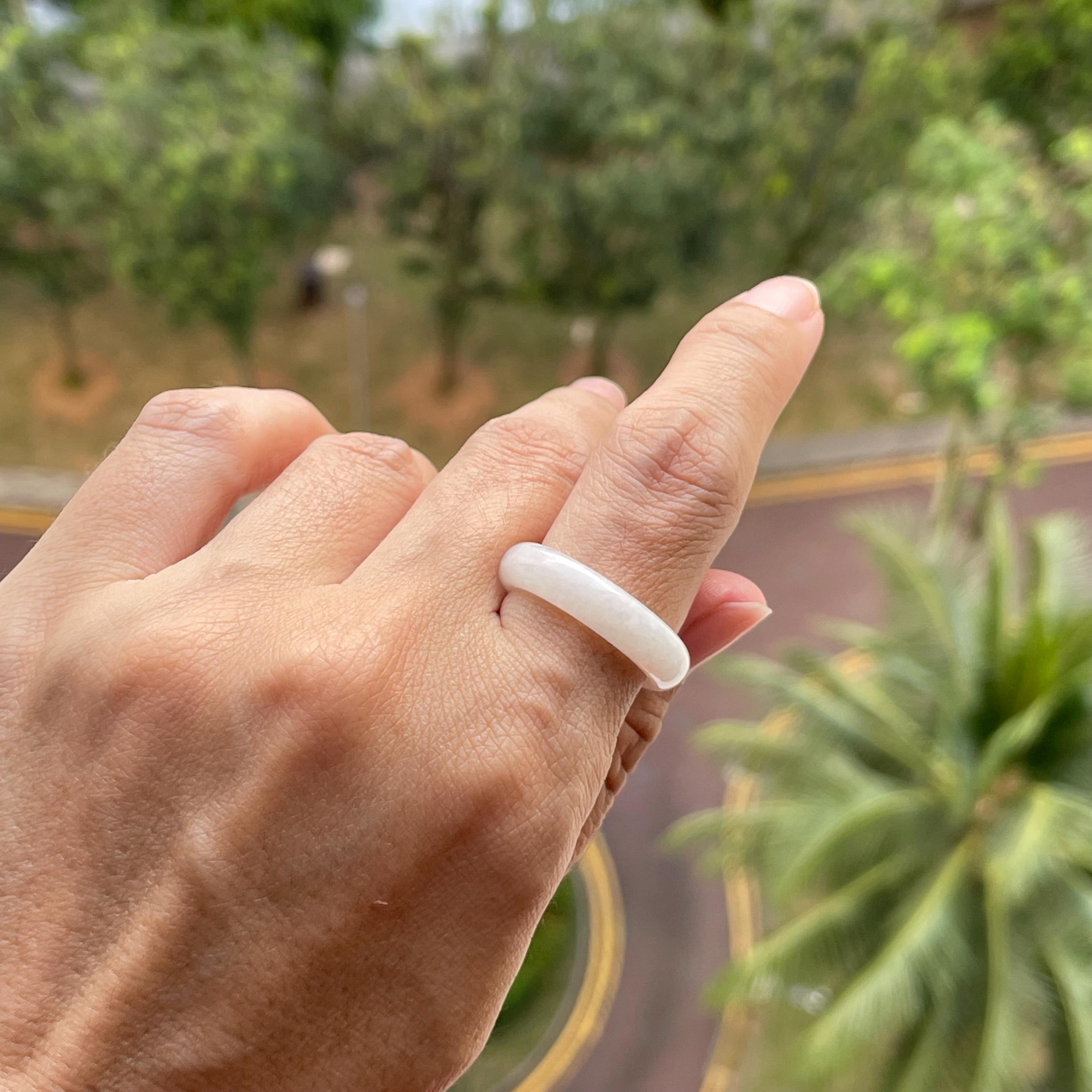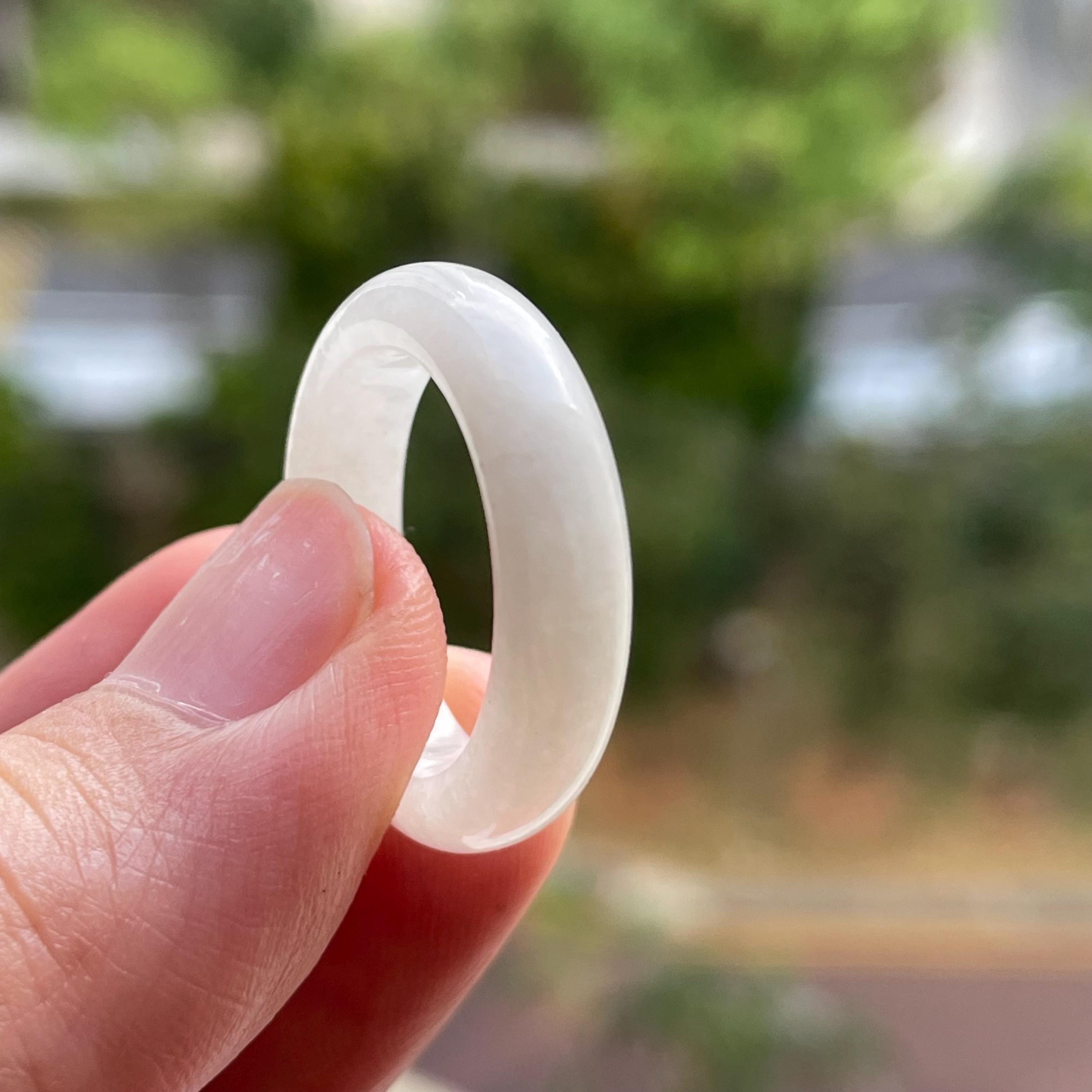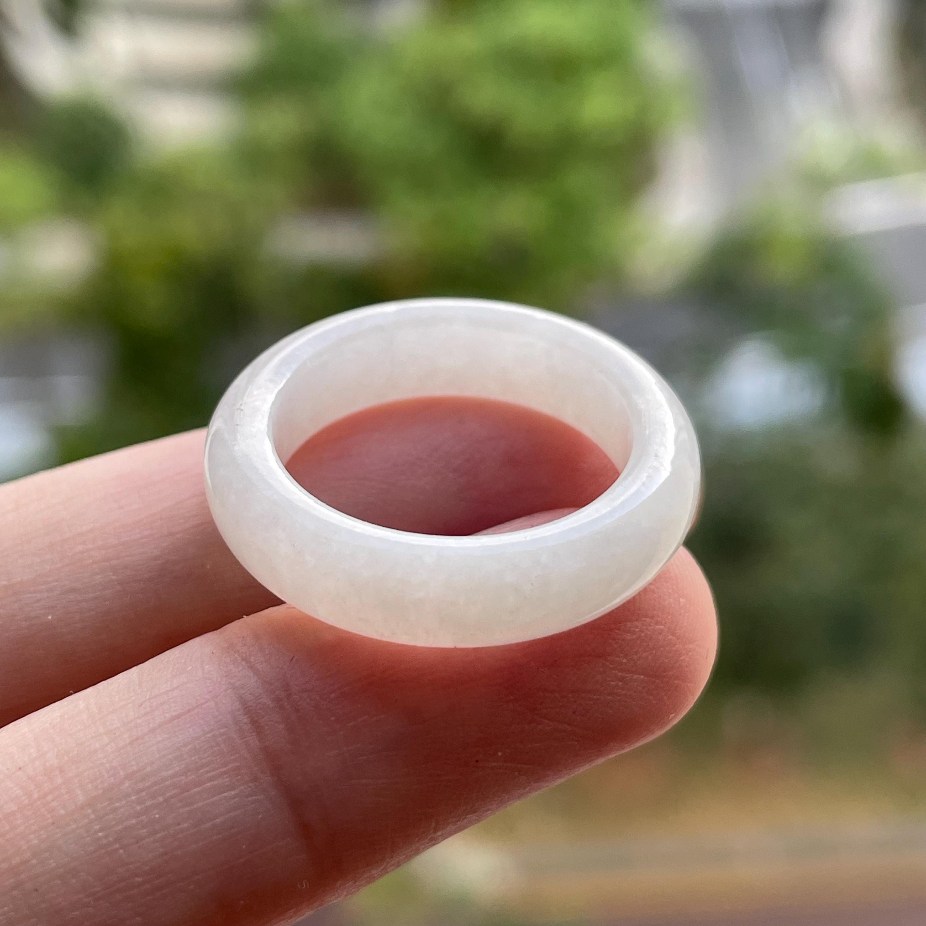 • The ring is hand carved from natural Burmese jadeite Boulder. It is neither treated nor bleached jade, moreover the color is natural and there is no chemical infilling thus this ring is categorized under Authentic Type A (Grade A) Jadeite. The main color is white for entire band with translucency.