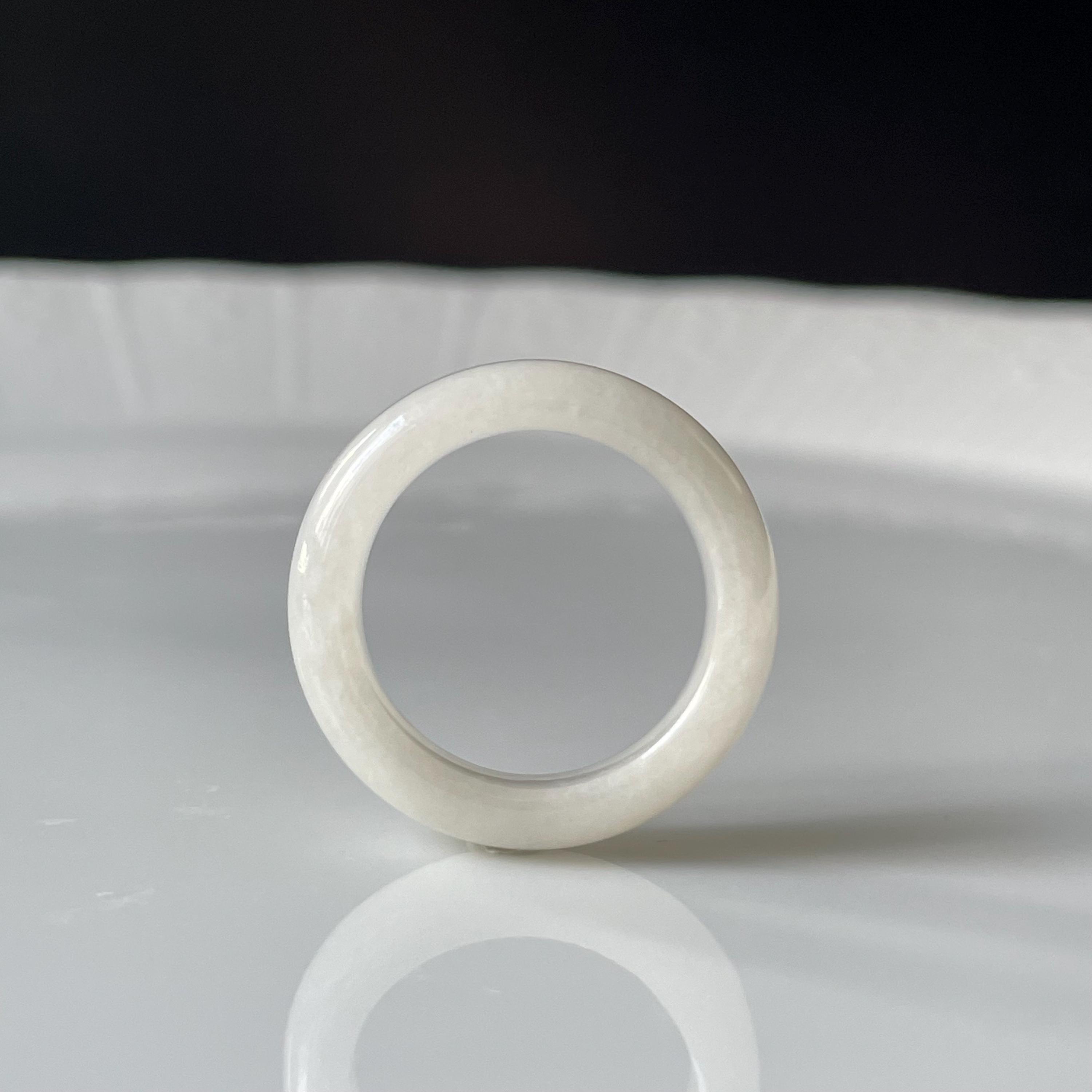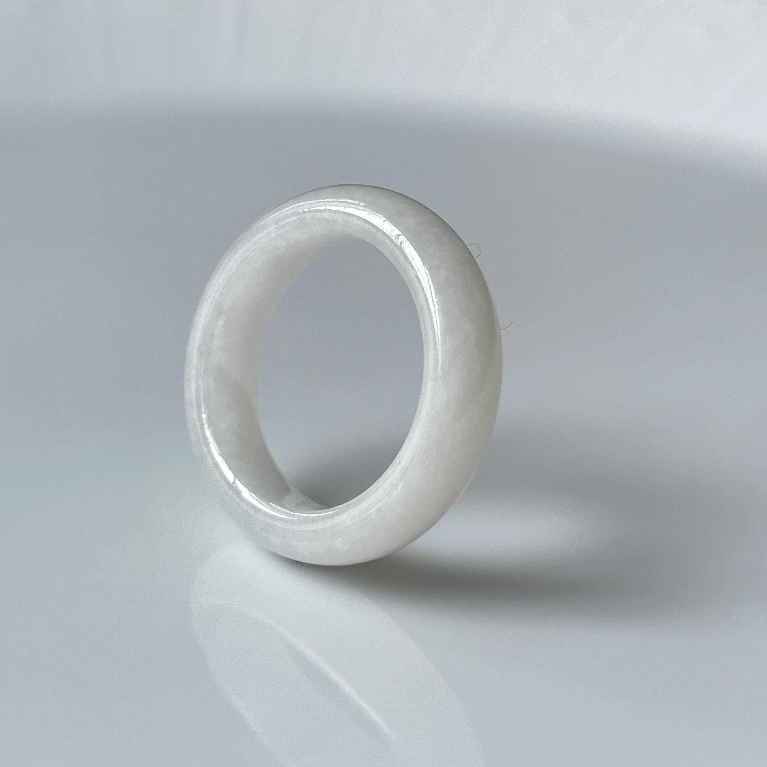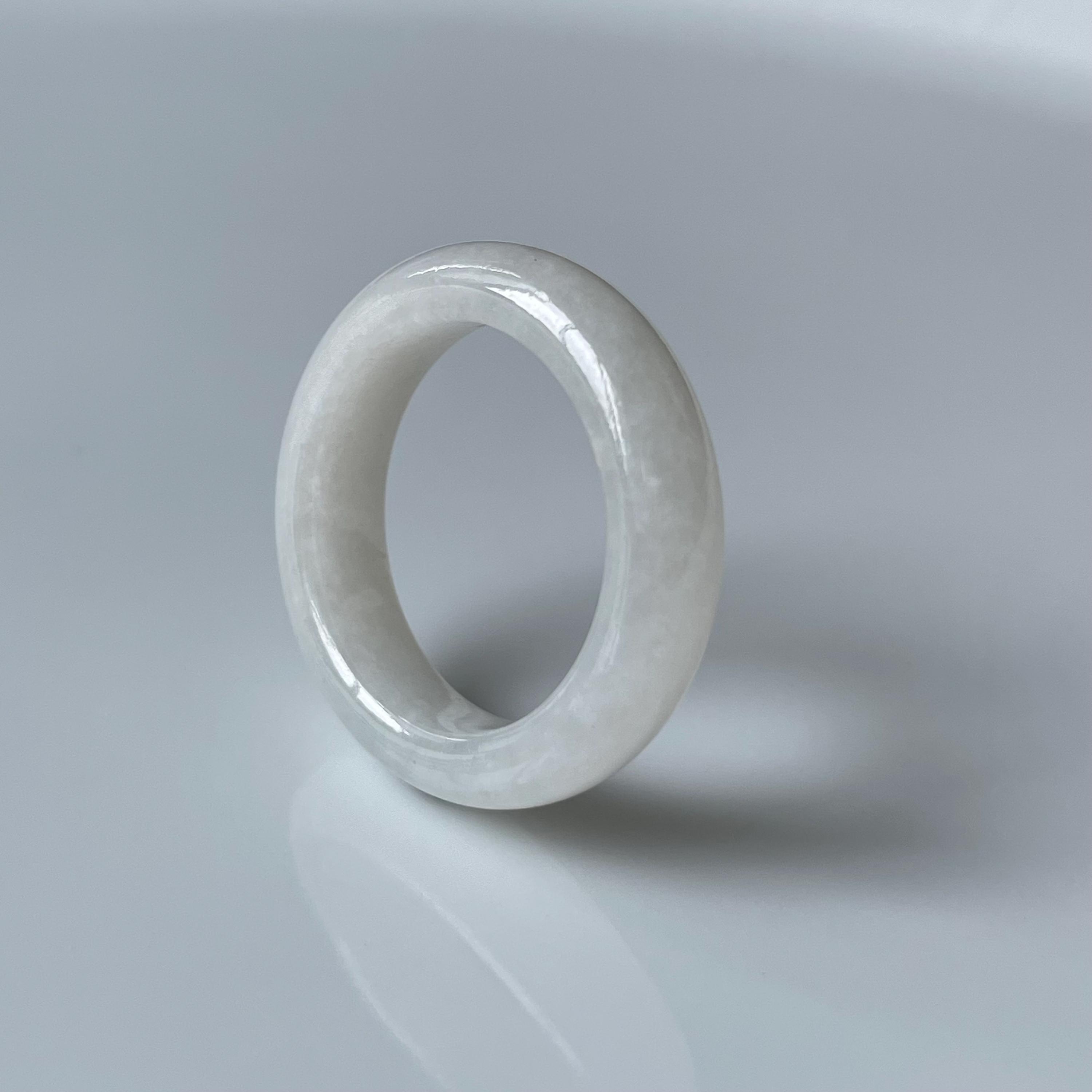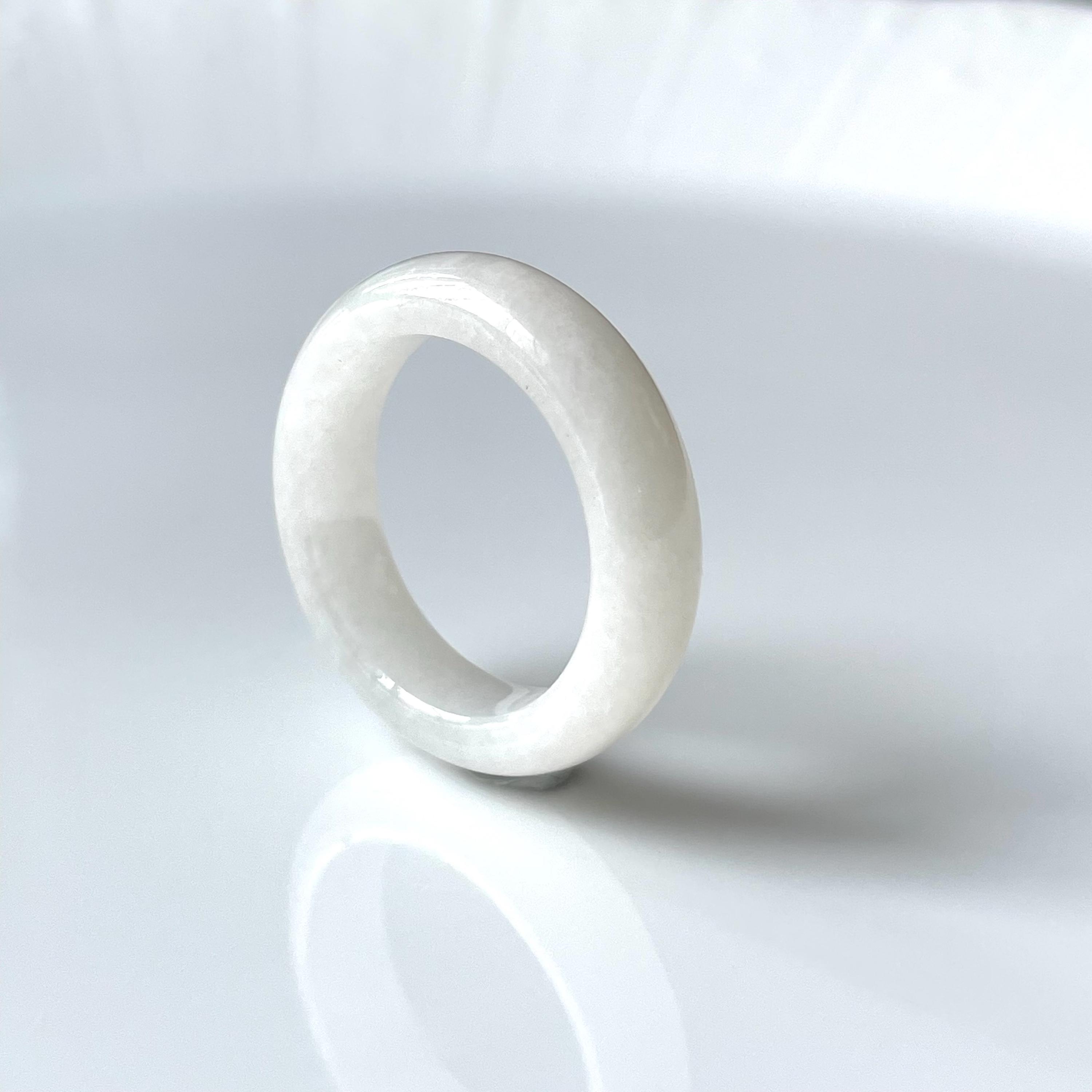 • The ring is hand carved from natural Burmese jadeite Boulder. It is neither treated nor bleached jade, moreover the color is natural and there is no chemical infilling thus this ring is categorized under Authentic Type A (Grade A) Jadeite. The main color is white for entire band with translucency.
