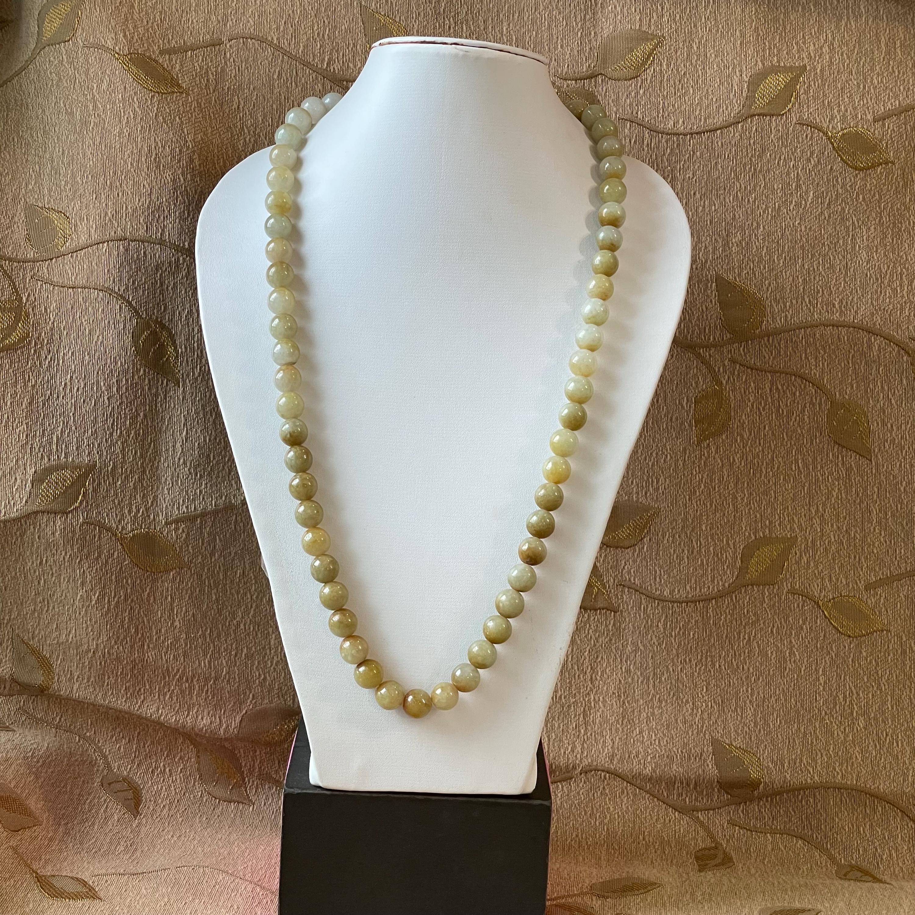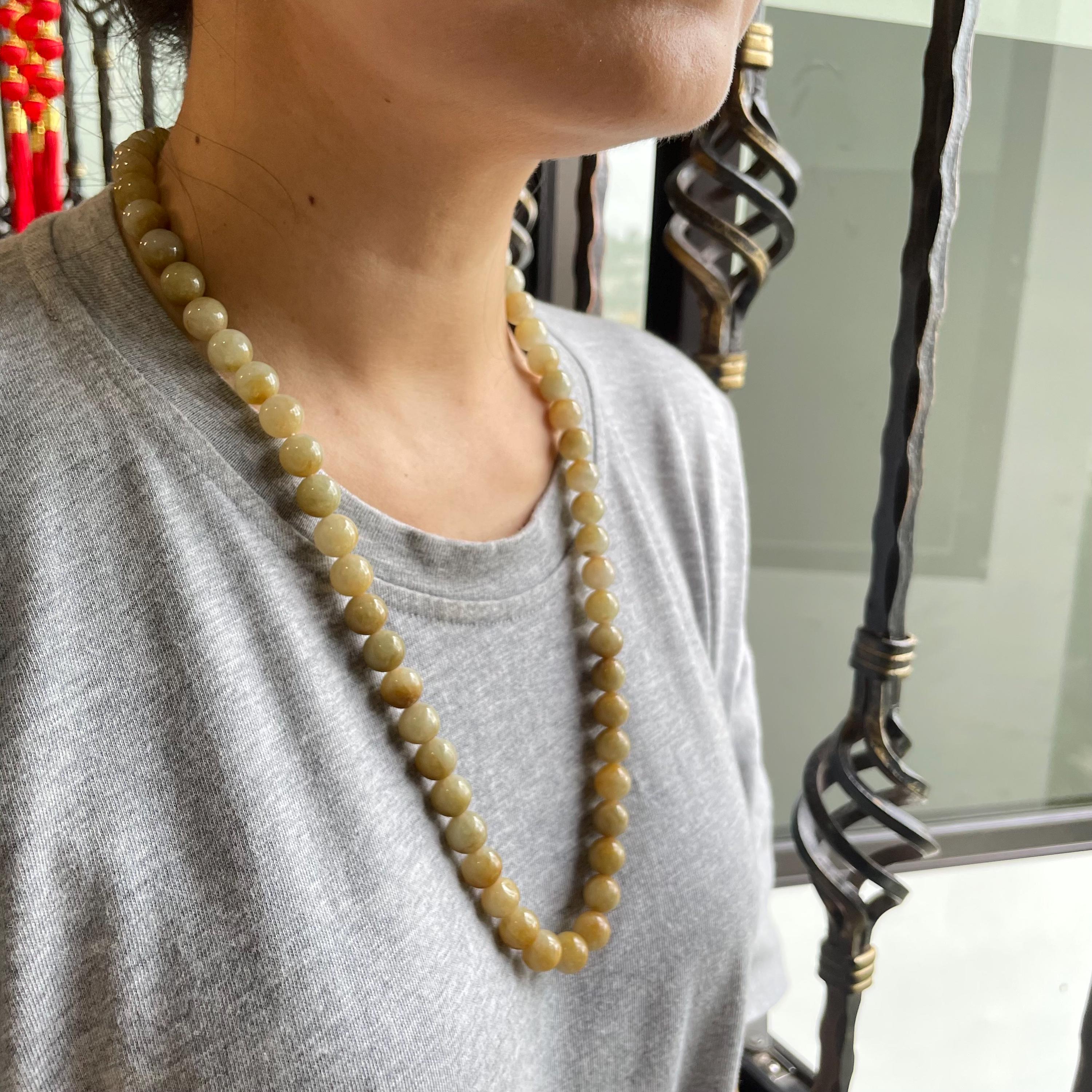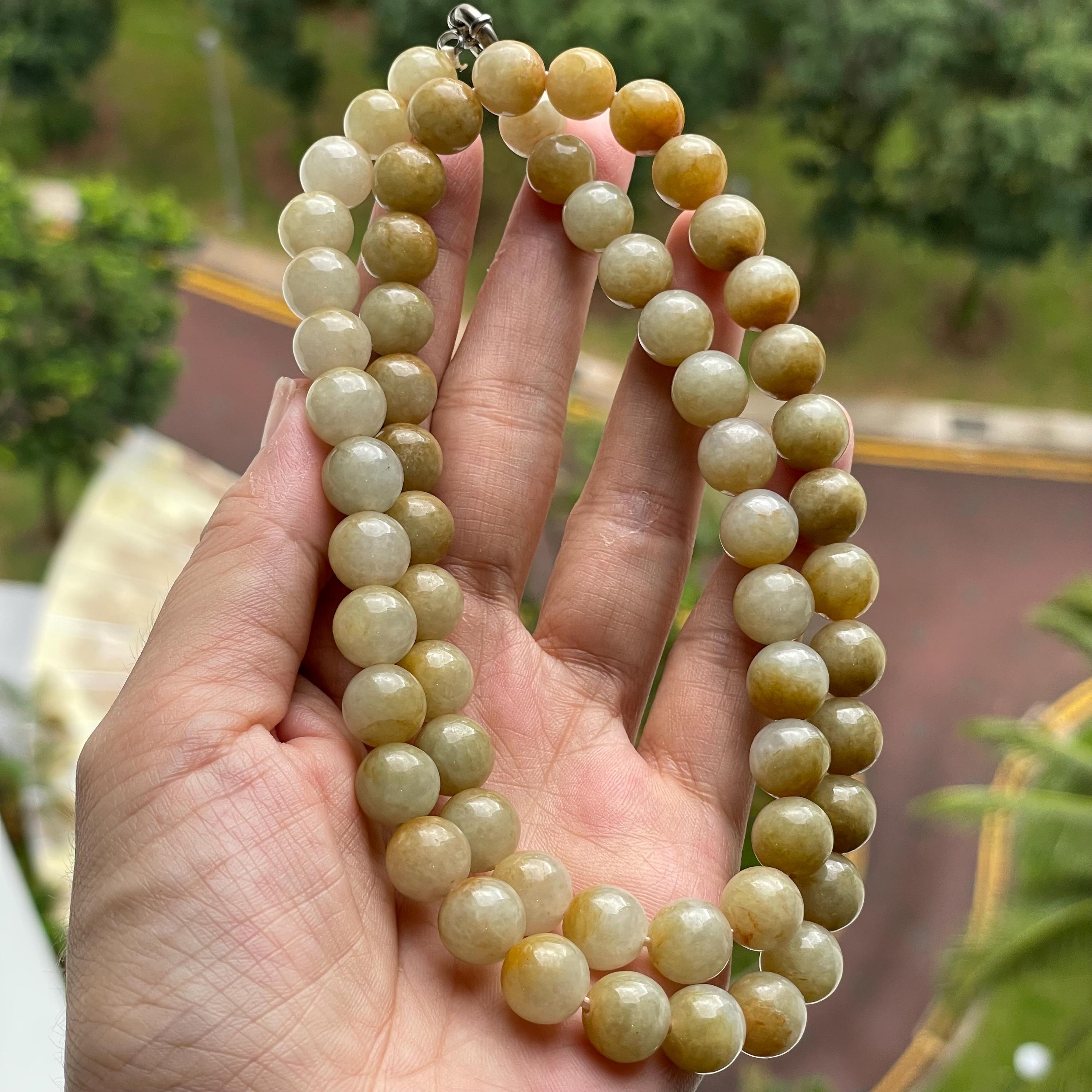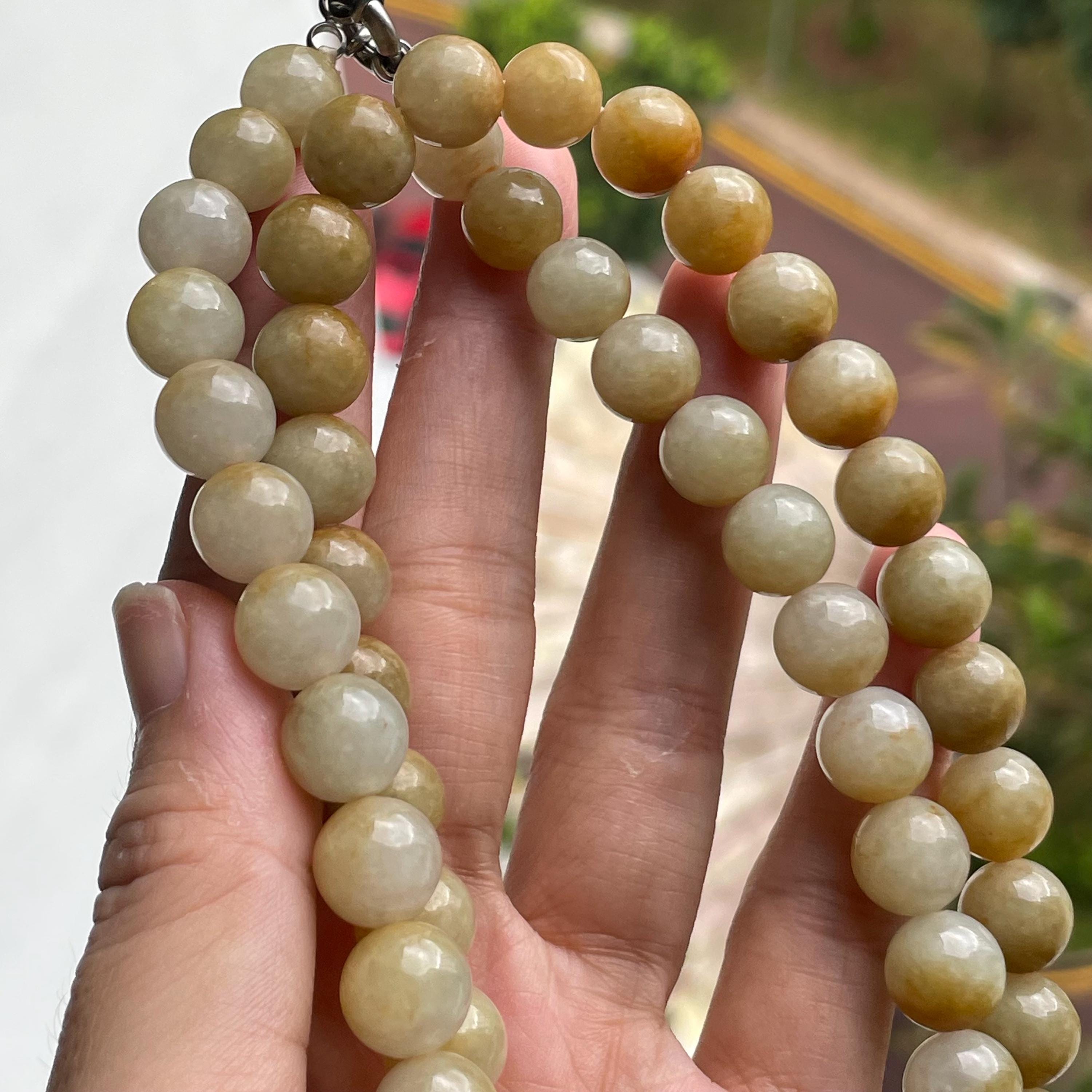 This Jade Bead Necklace is made with Natural Undyed, Untreated Type A Jadeite Jade from Burma (Myanmar). The beads occupy rare brownish yellow color with mixture of olive green. This amazing one of a kind natural color combination makes this necklace unique and special. The beads are beautifully and manually strung on white cord with metal spring ring closure.