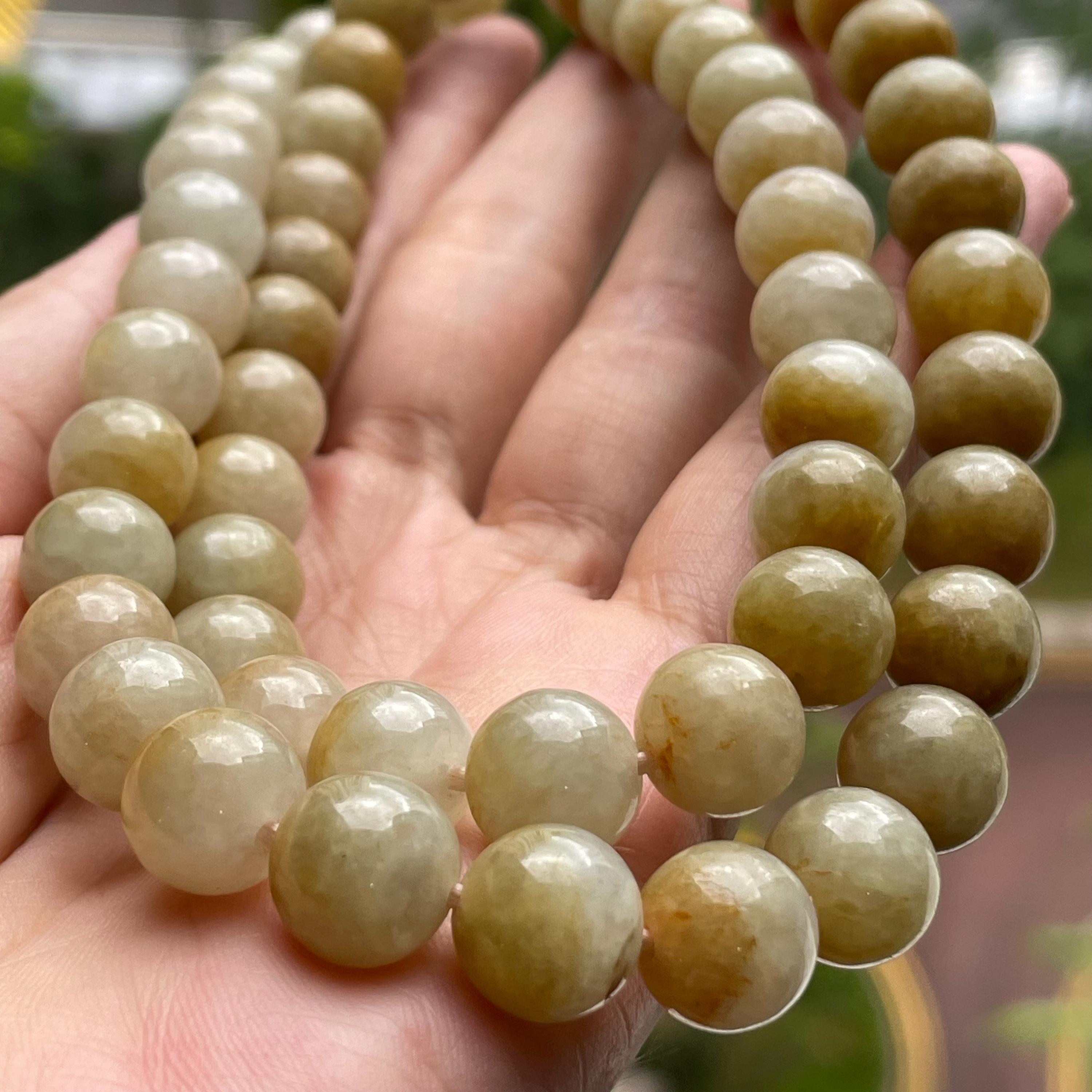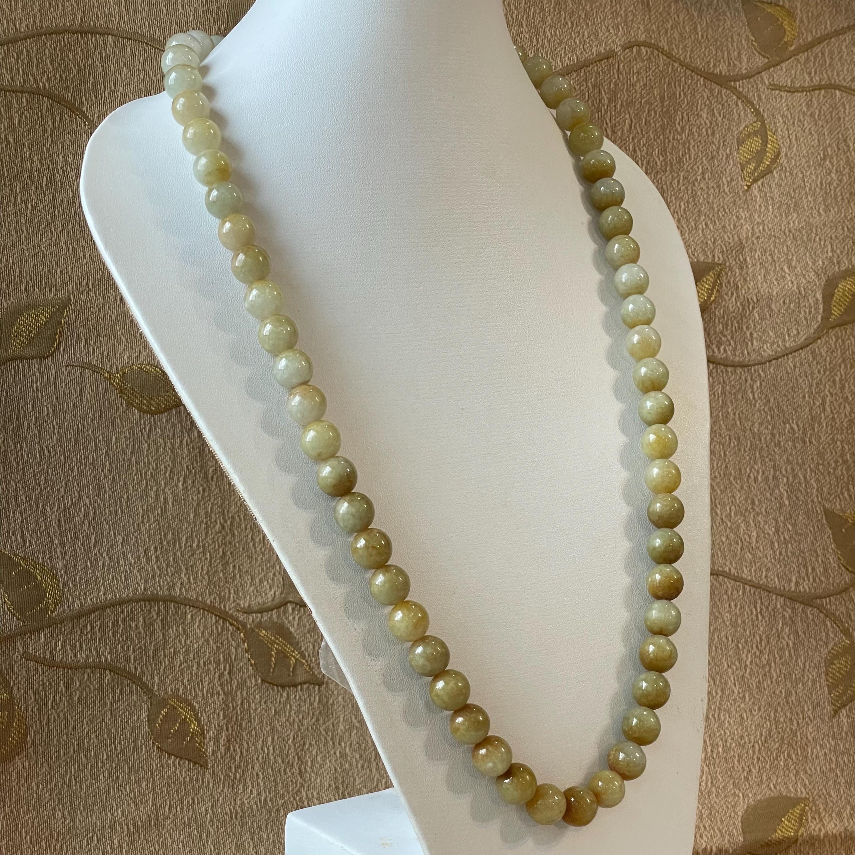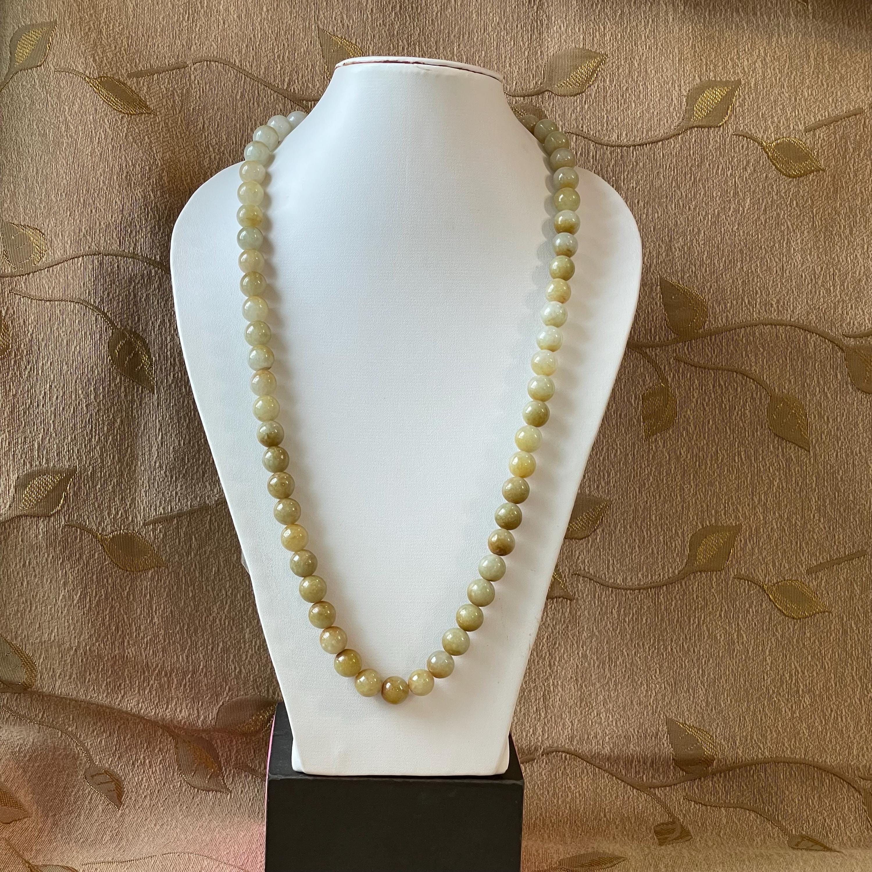 This Jade Bead Necklace is made with Natural Undyed, Untreated Type A Jadeite Jade from Burma (Myanmar). The beads occupy rare brownish yellow color with mixture of olive green. This amazing one of a kind natural color combination makes this necklace unique and special. The beads are beautifully and manually strung on white cord with metal spring ring closure.