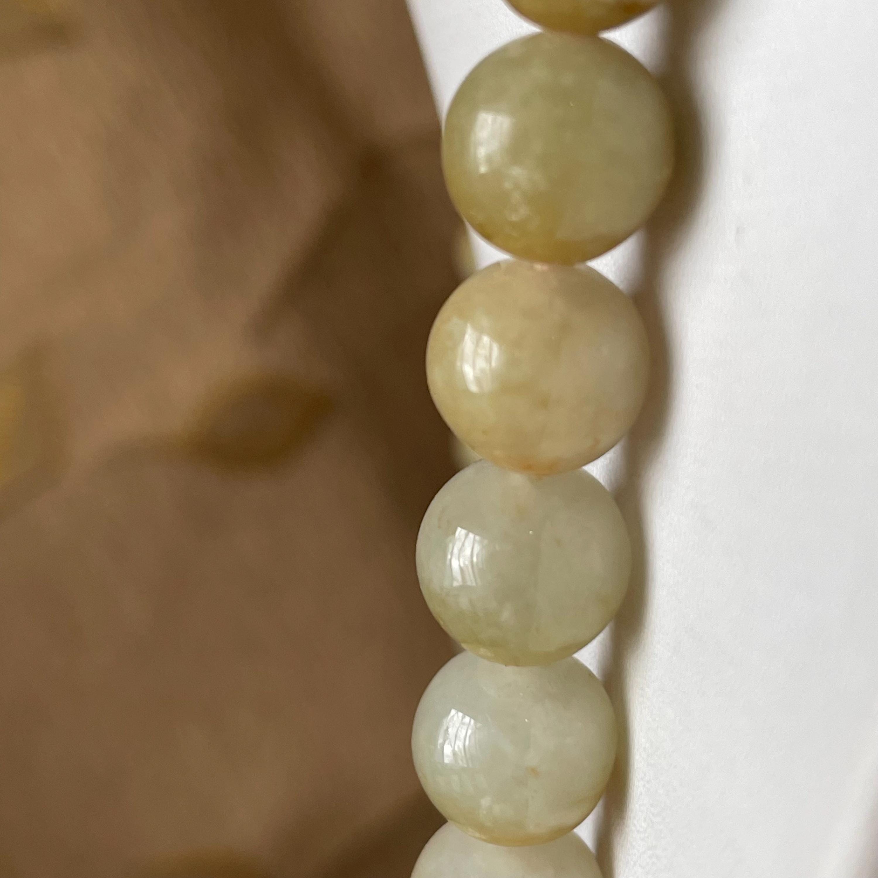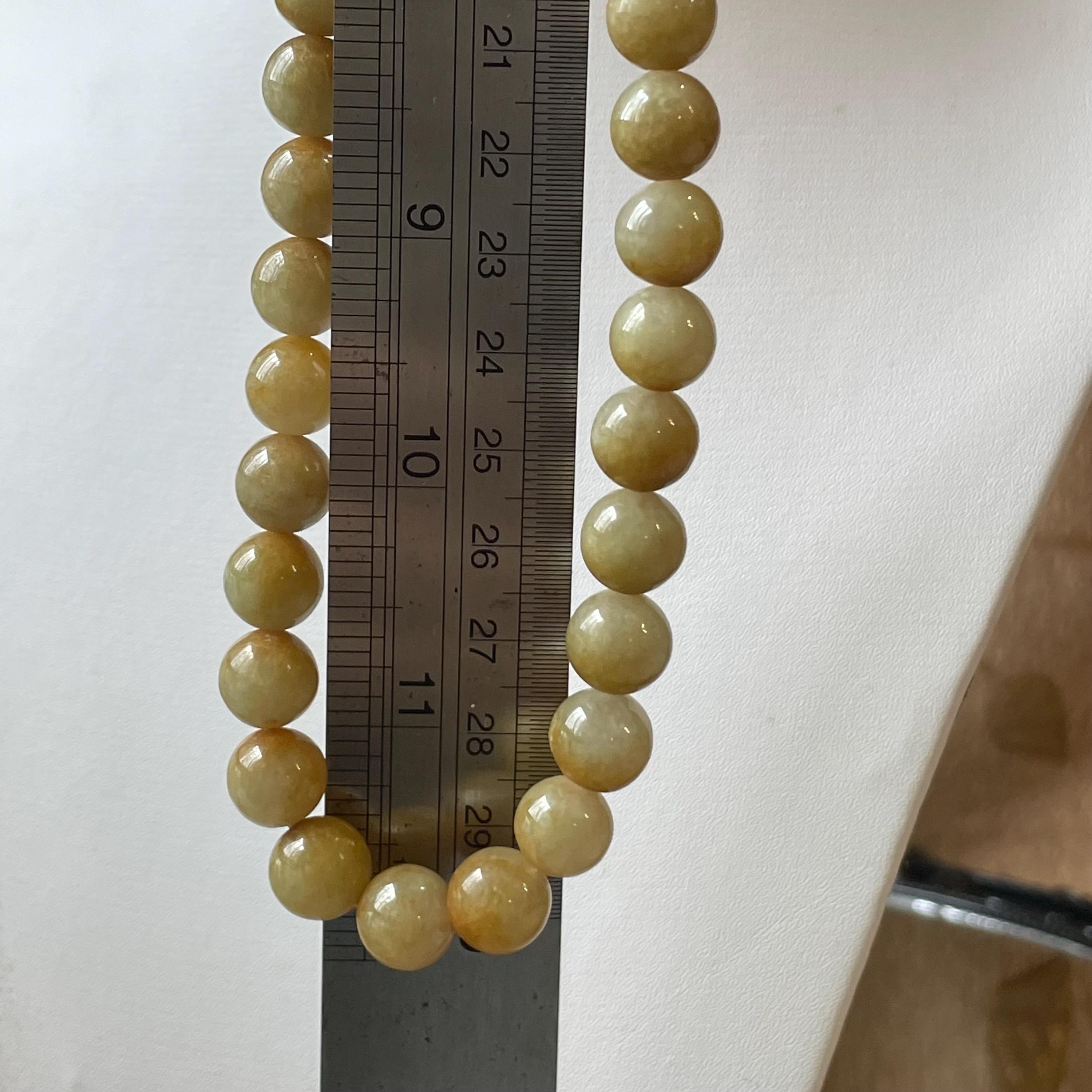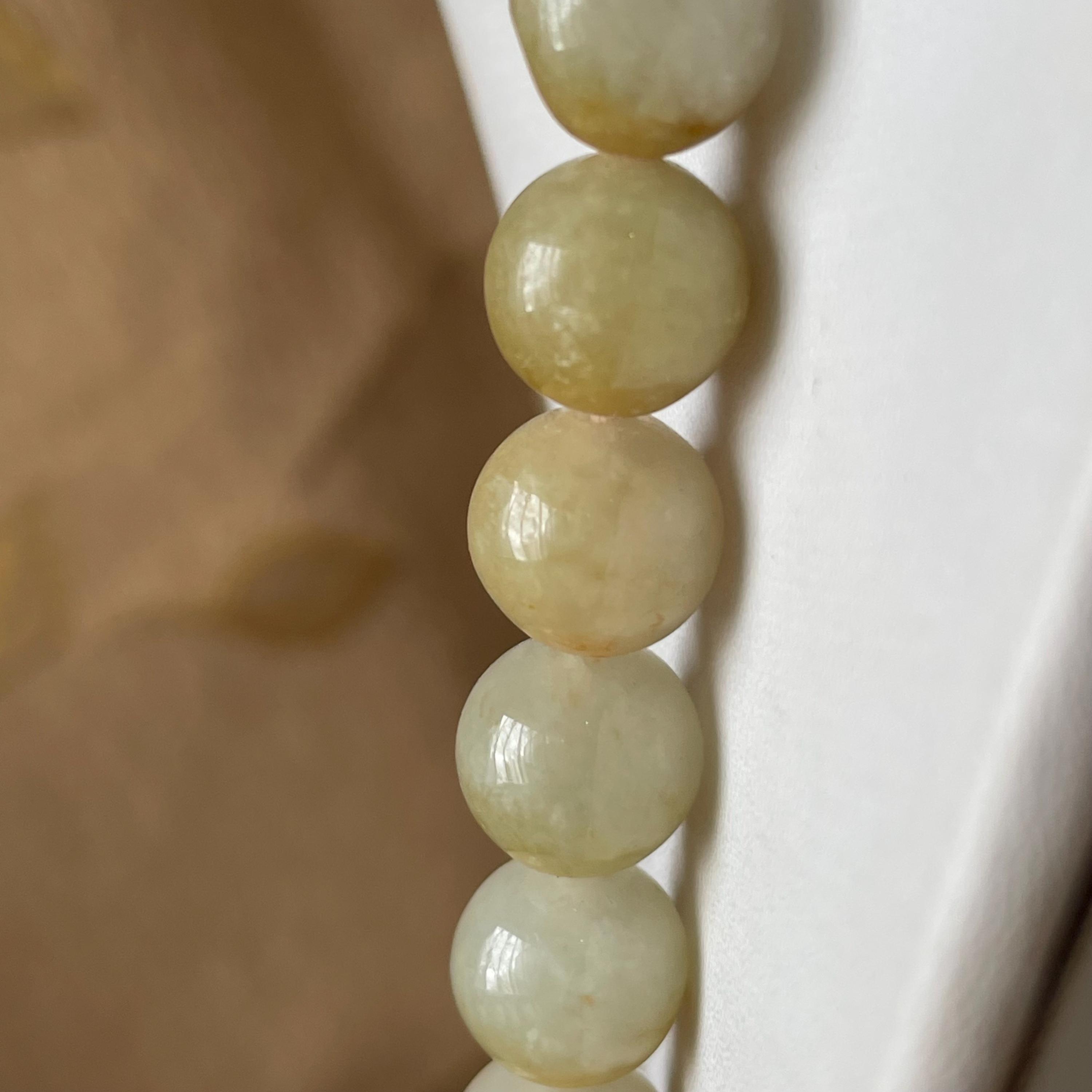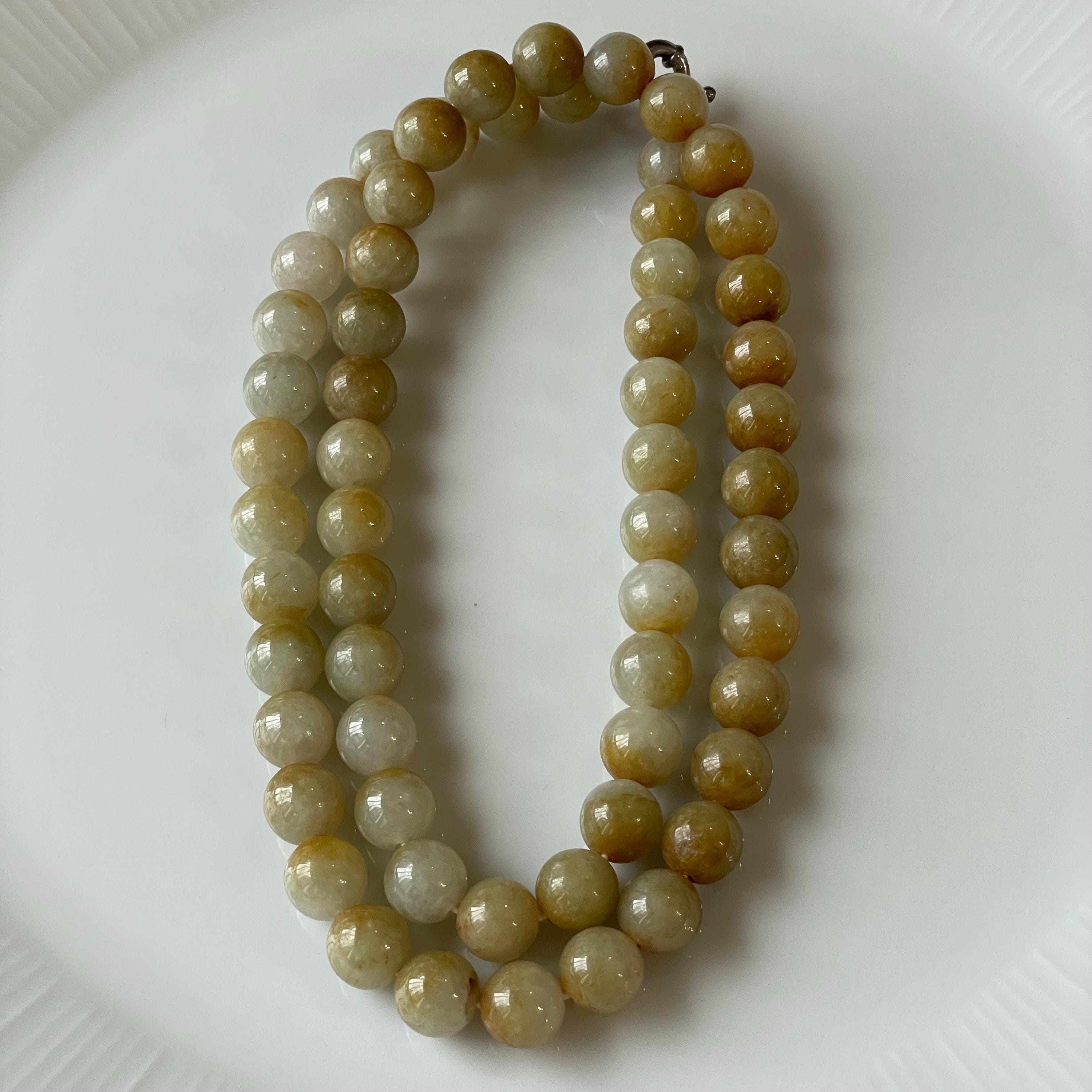 This Jade Bead Necklace is made with Natural Undyed, Untreated Type A Jadeite Jade from Burma (Myanmar). The beads occupy rare brownish yellow color with mixture of olive green. This amazing one of a kind natural color combination makes this necklace unique and special. The beads are beautifully and manually strung on white cord with metal spring ring closure.