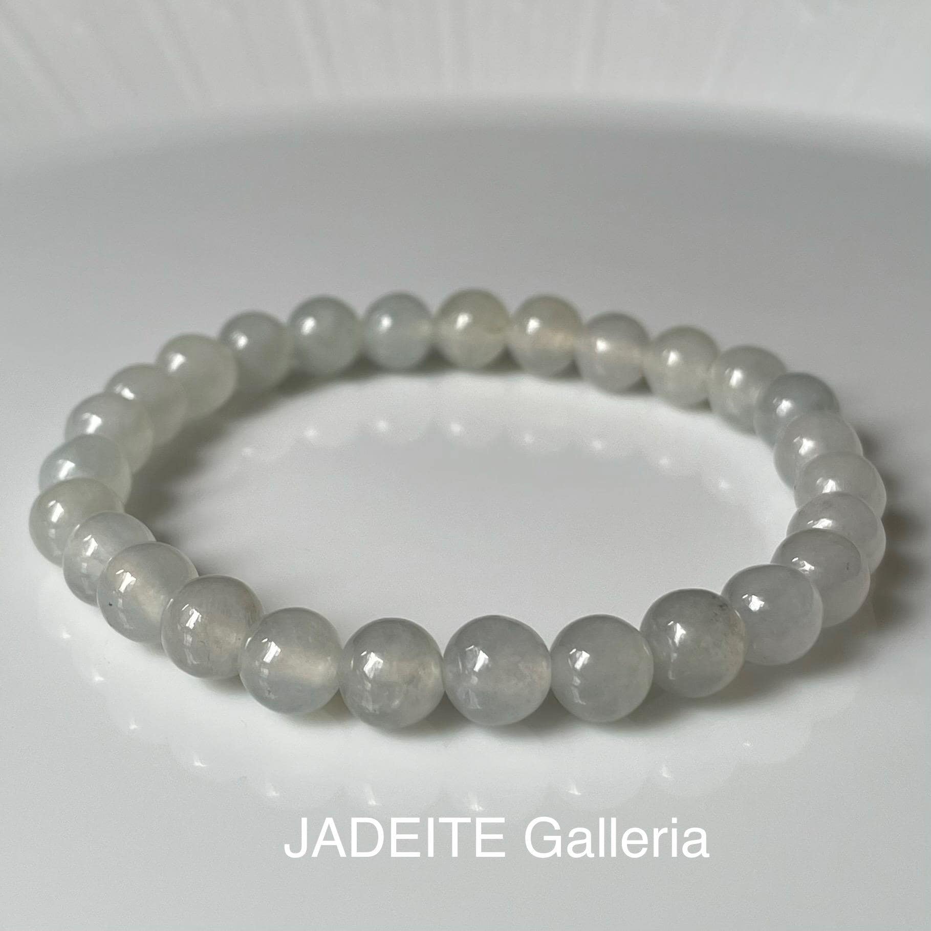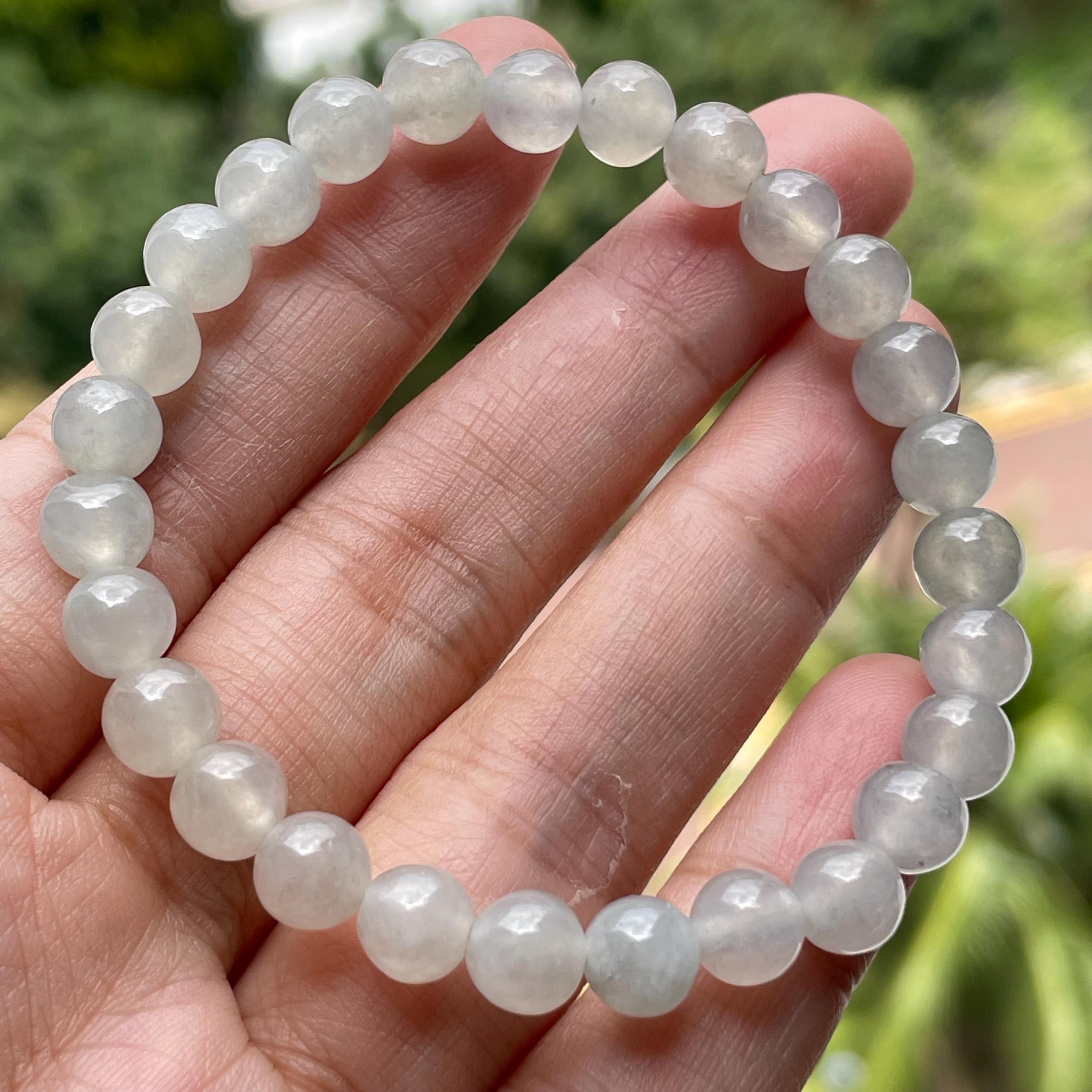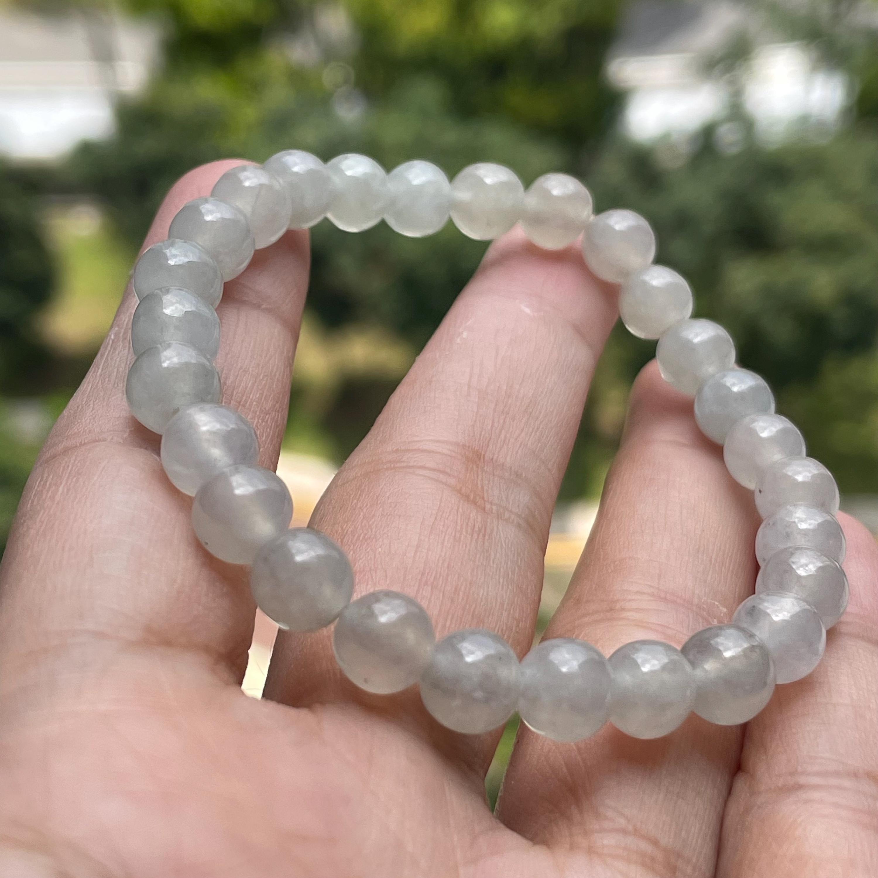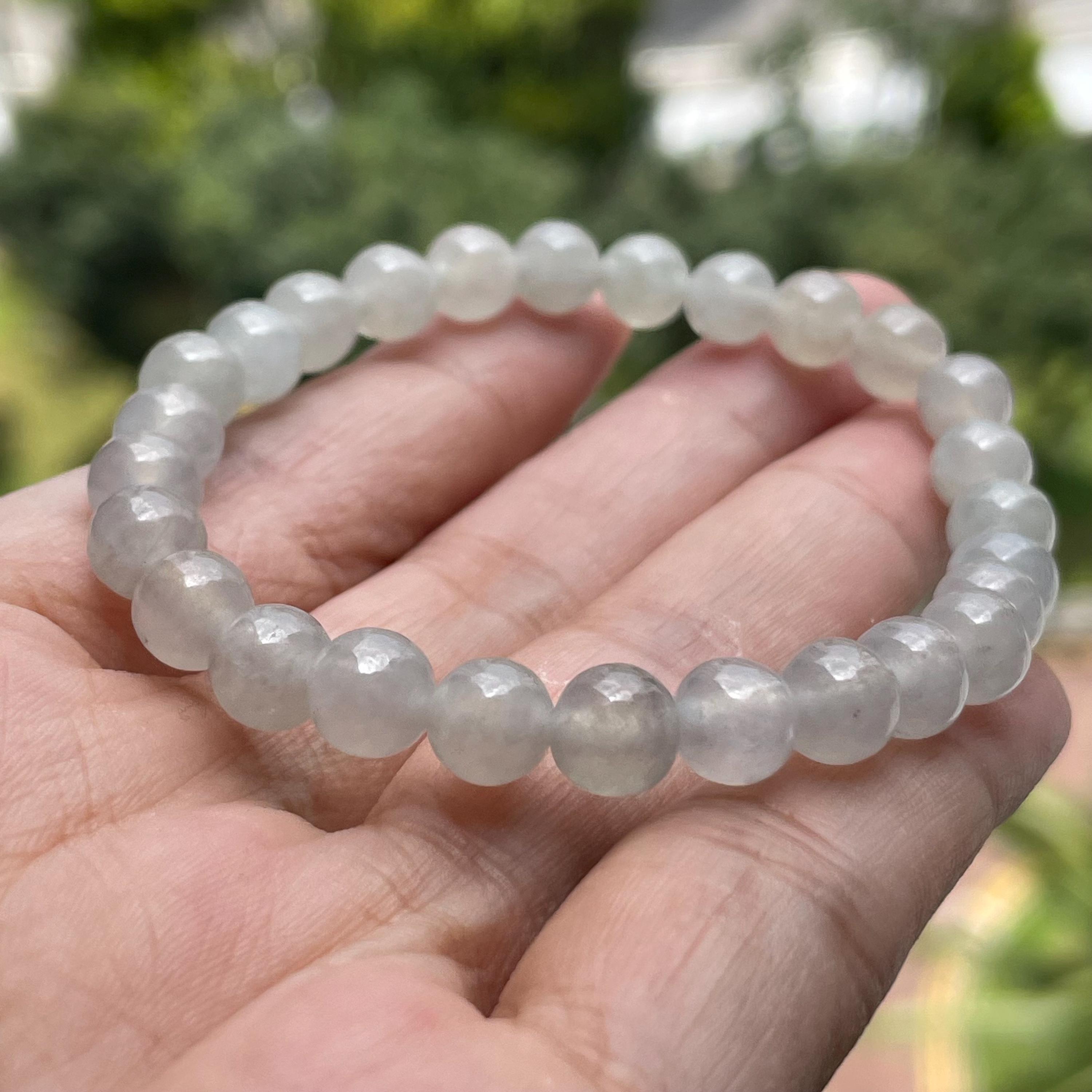 This Jadeite Jade Bead Bracelet is Free of Treatment from Artificial coloring/bleaching/chemical infilling. It occupies natural white color/ colorless with high translucency and vitreous luster. 27 pieces of round jade beads are threaded on elastic string.