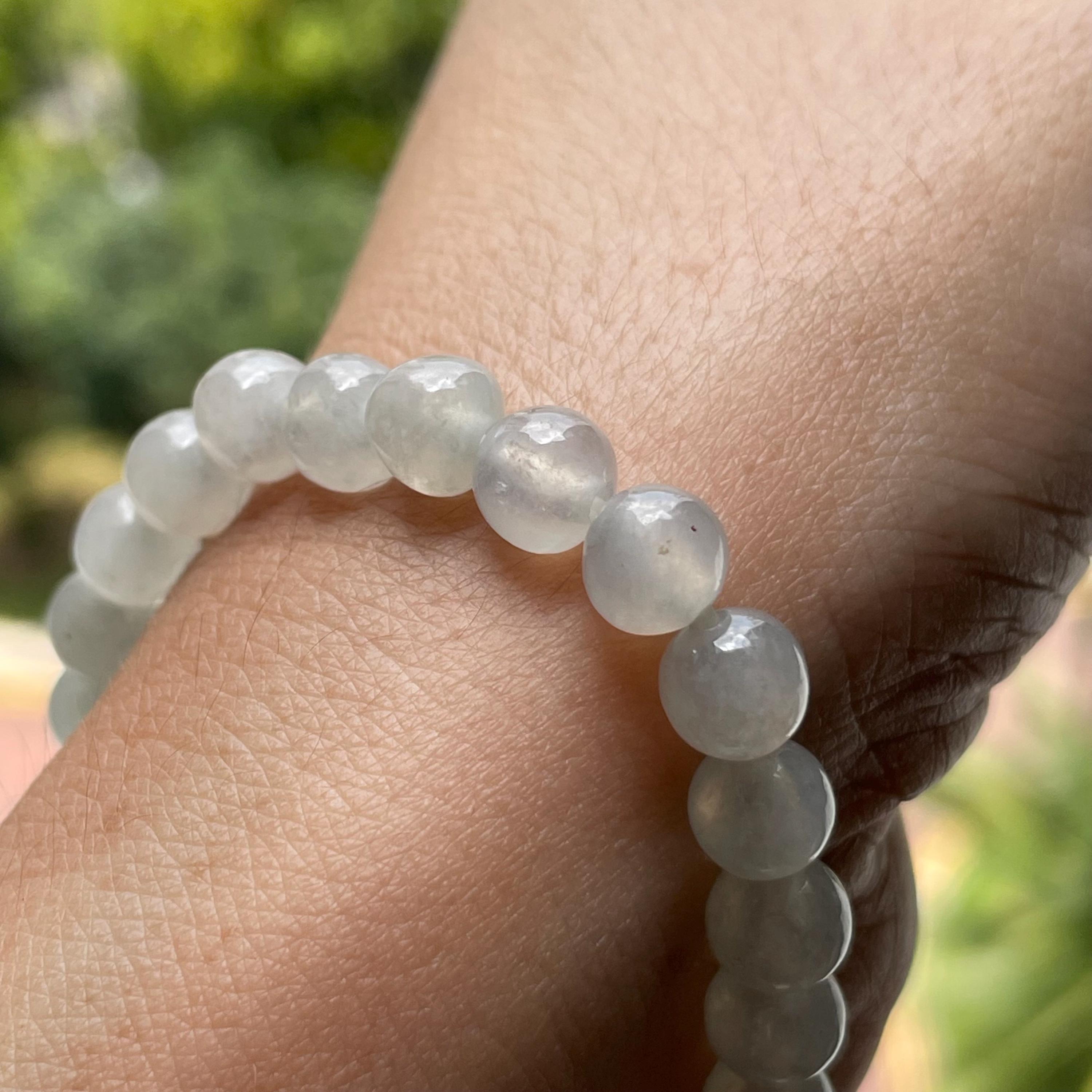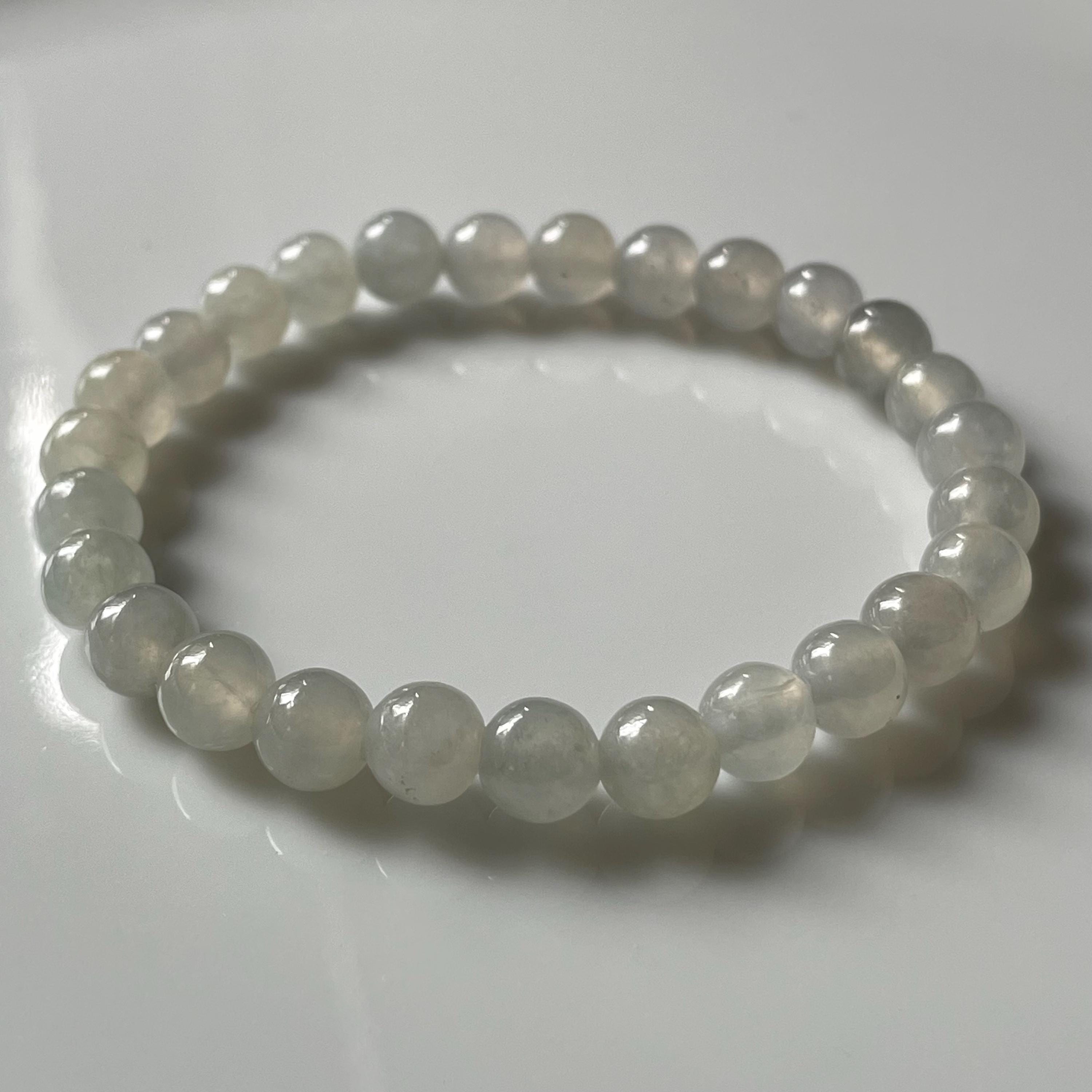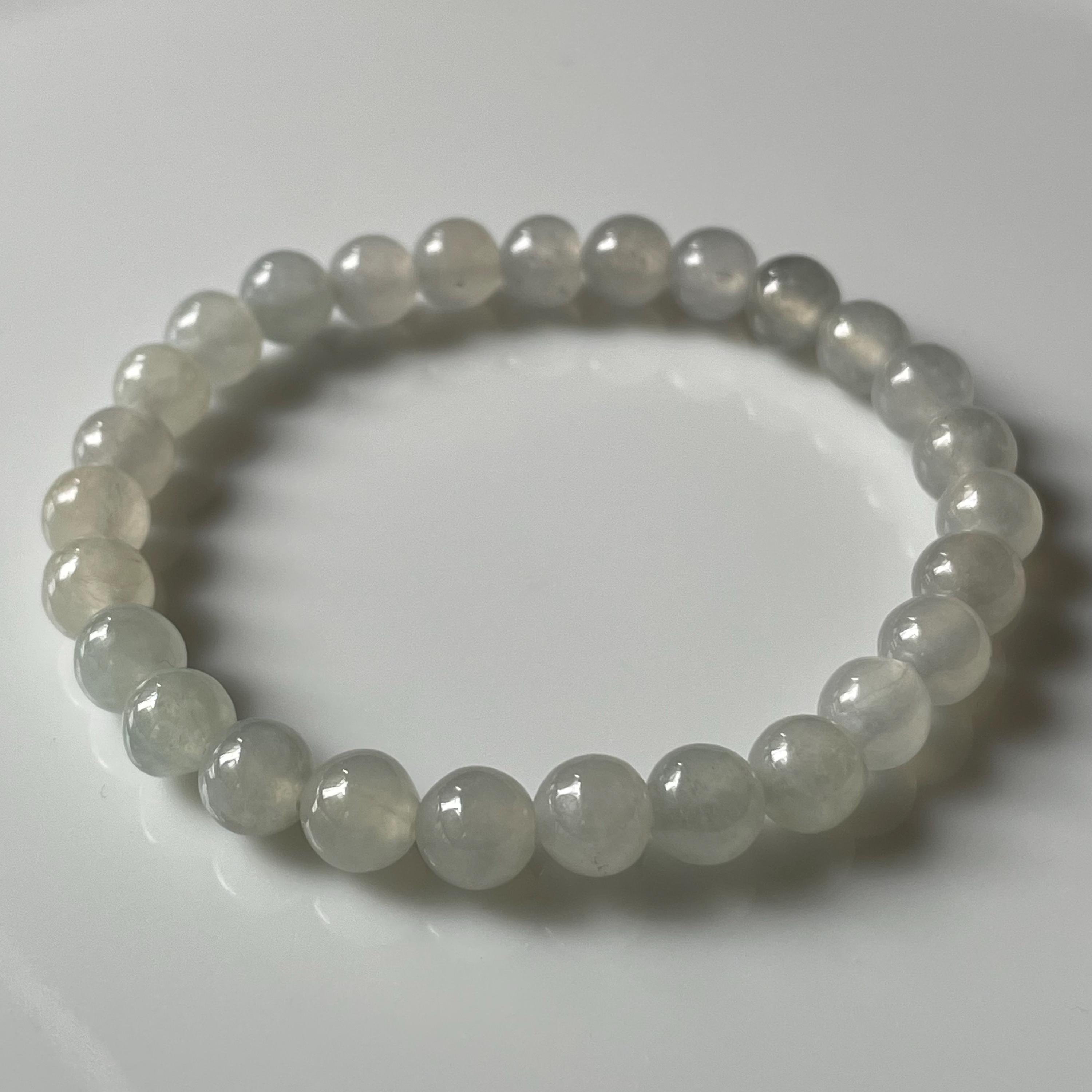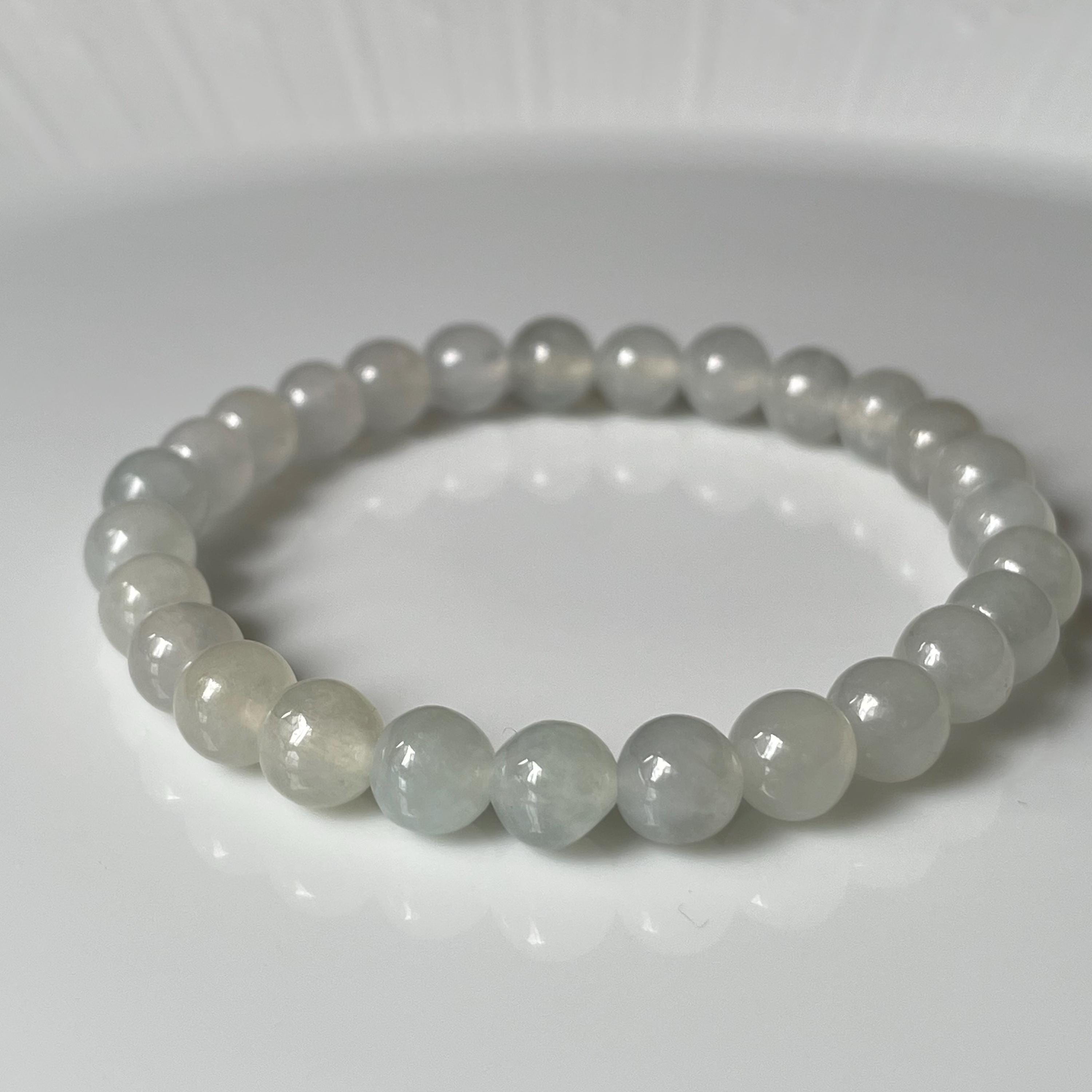 This Jadeite Jade Bead Bracelet is Free of Treatment from Artificial coloring/bleaching/chemical infilling. It occupies natural white color/ colorless with high translucency and vitreous luster. 27 pieces of round jade beads are threaded on elastic string.