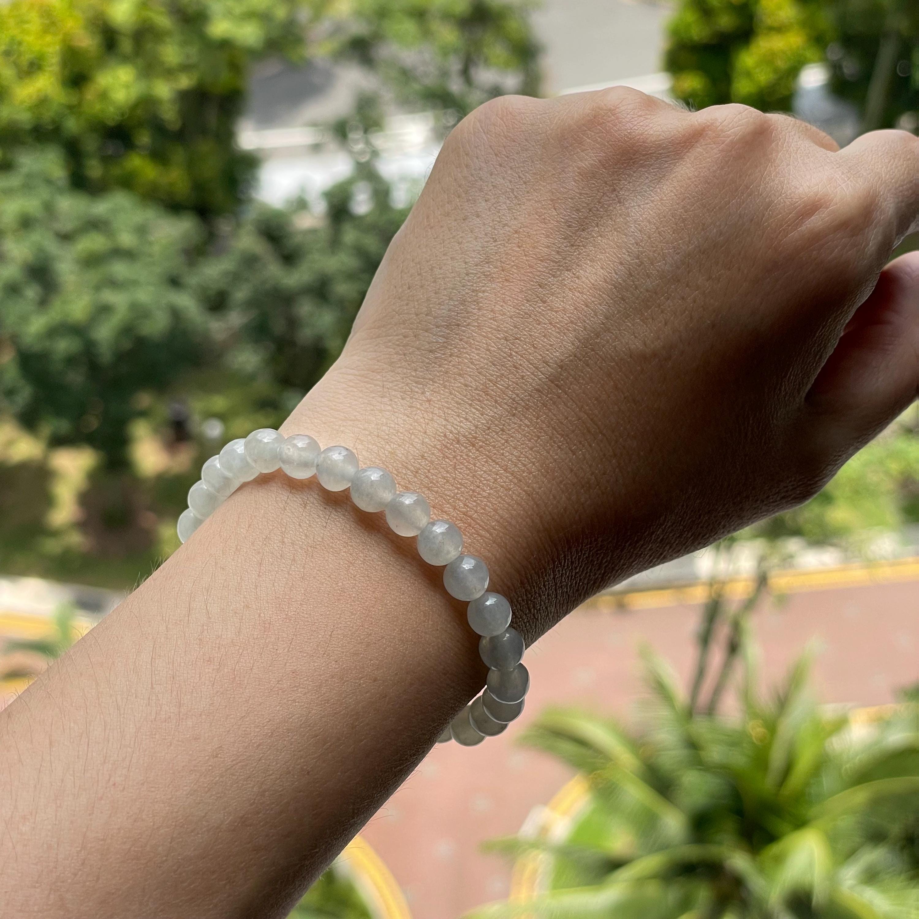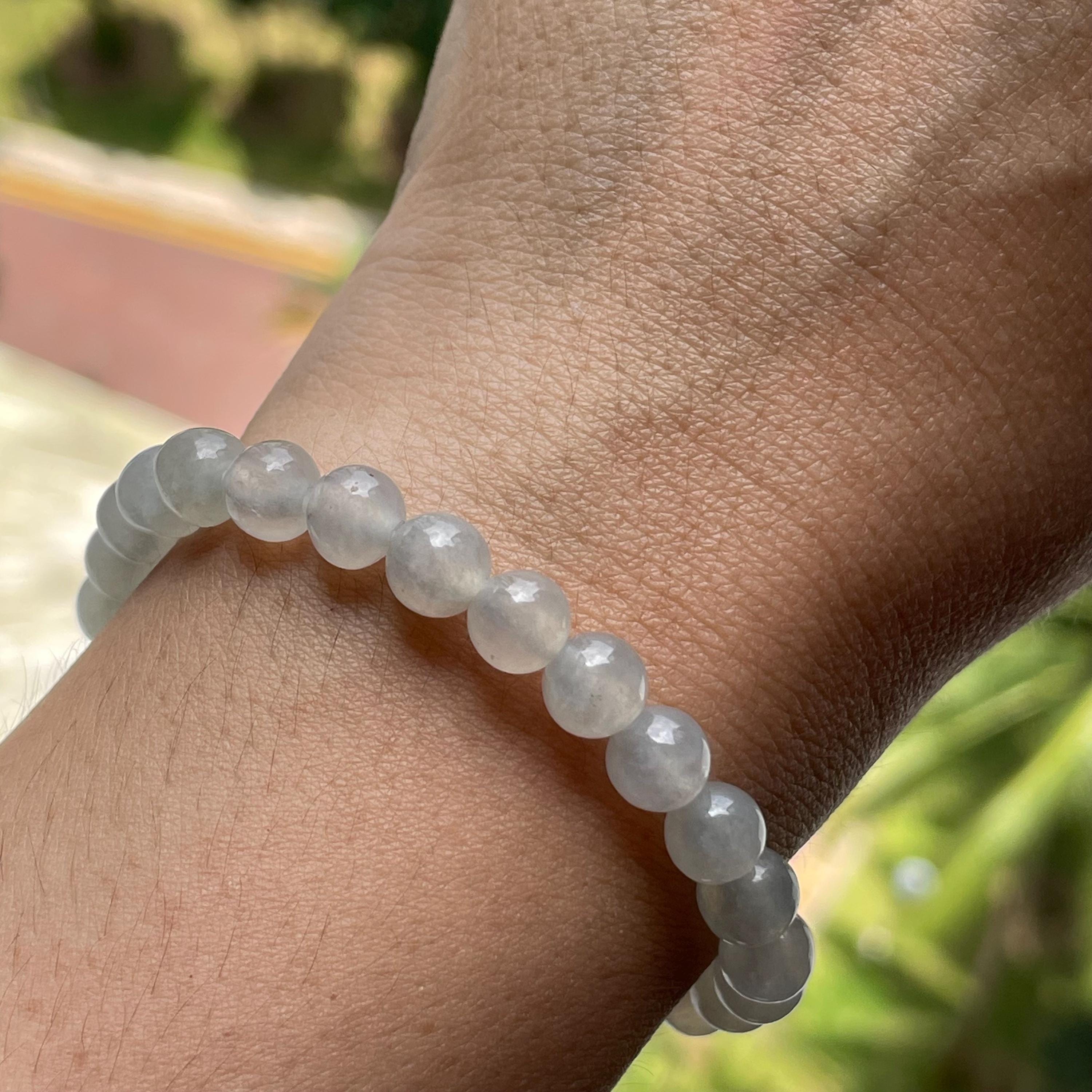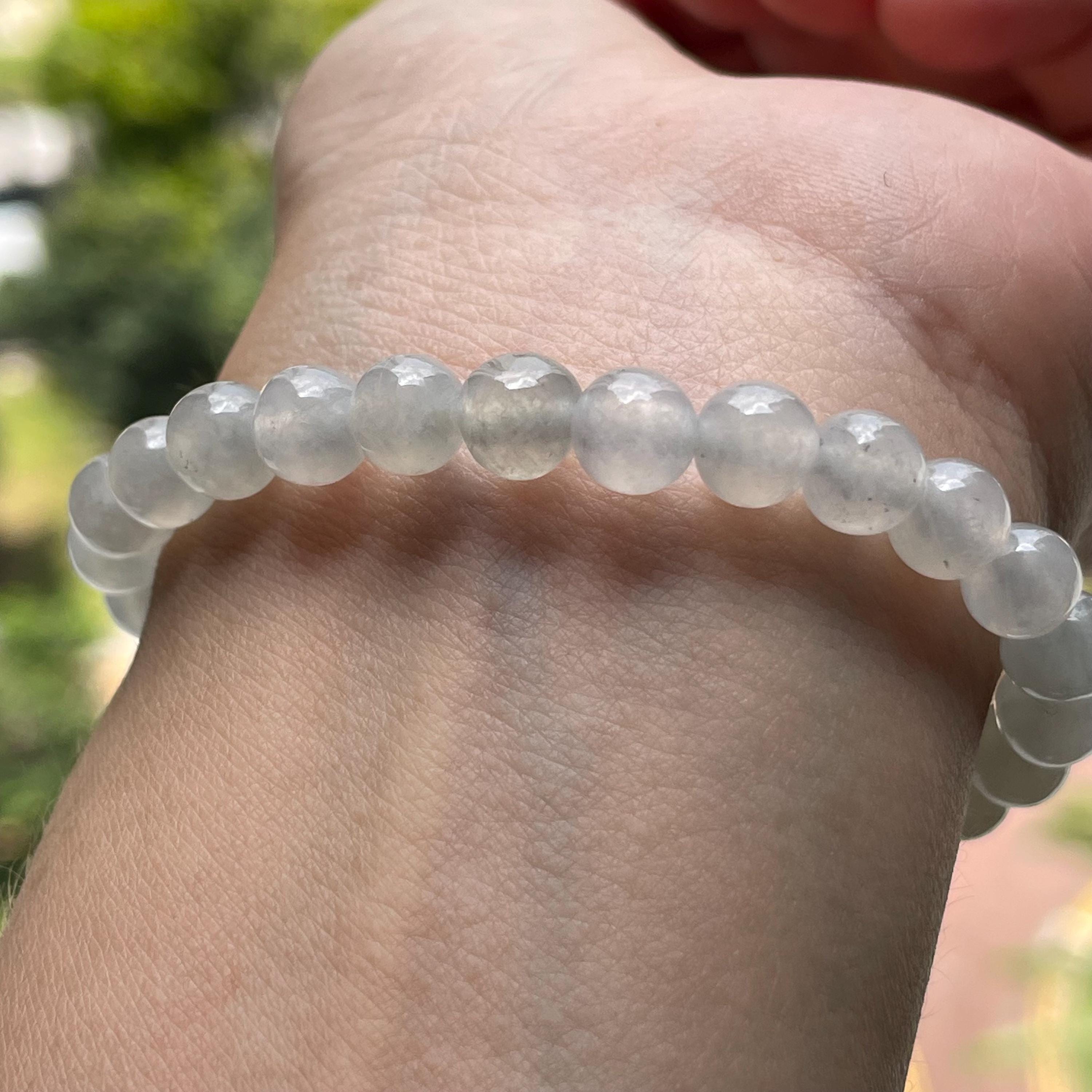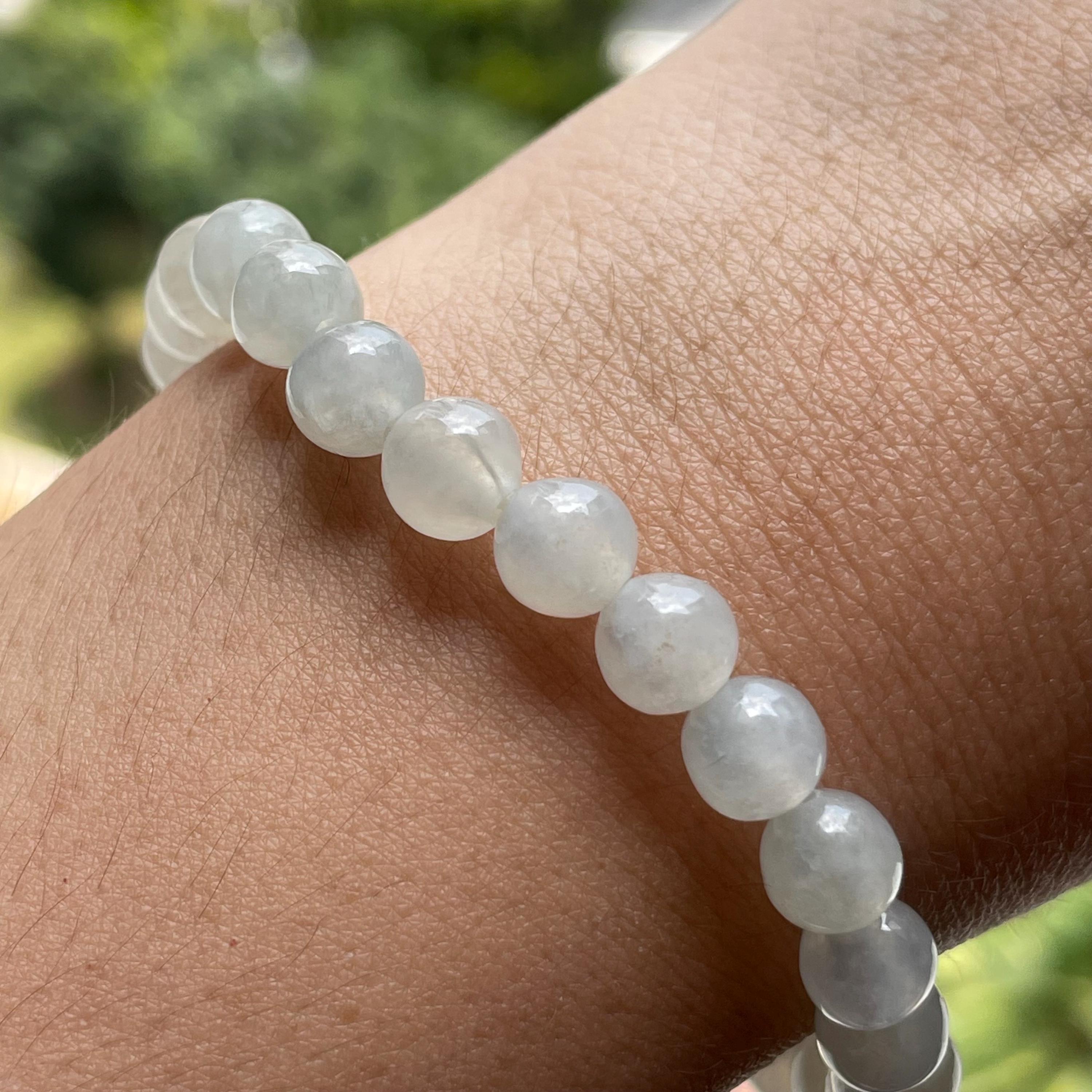 This Jadeite Jade Bead Bracelet is Free of Treatment from Artificial coloring/bleaching/chemical infilling. It occupies natural white color/ colorless with high translucency and vitreous luster. 27 pieces of round jade beads are threaded on elastic string.