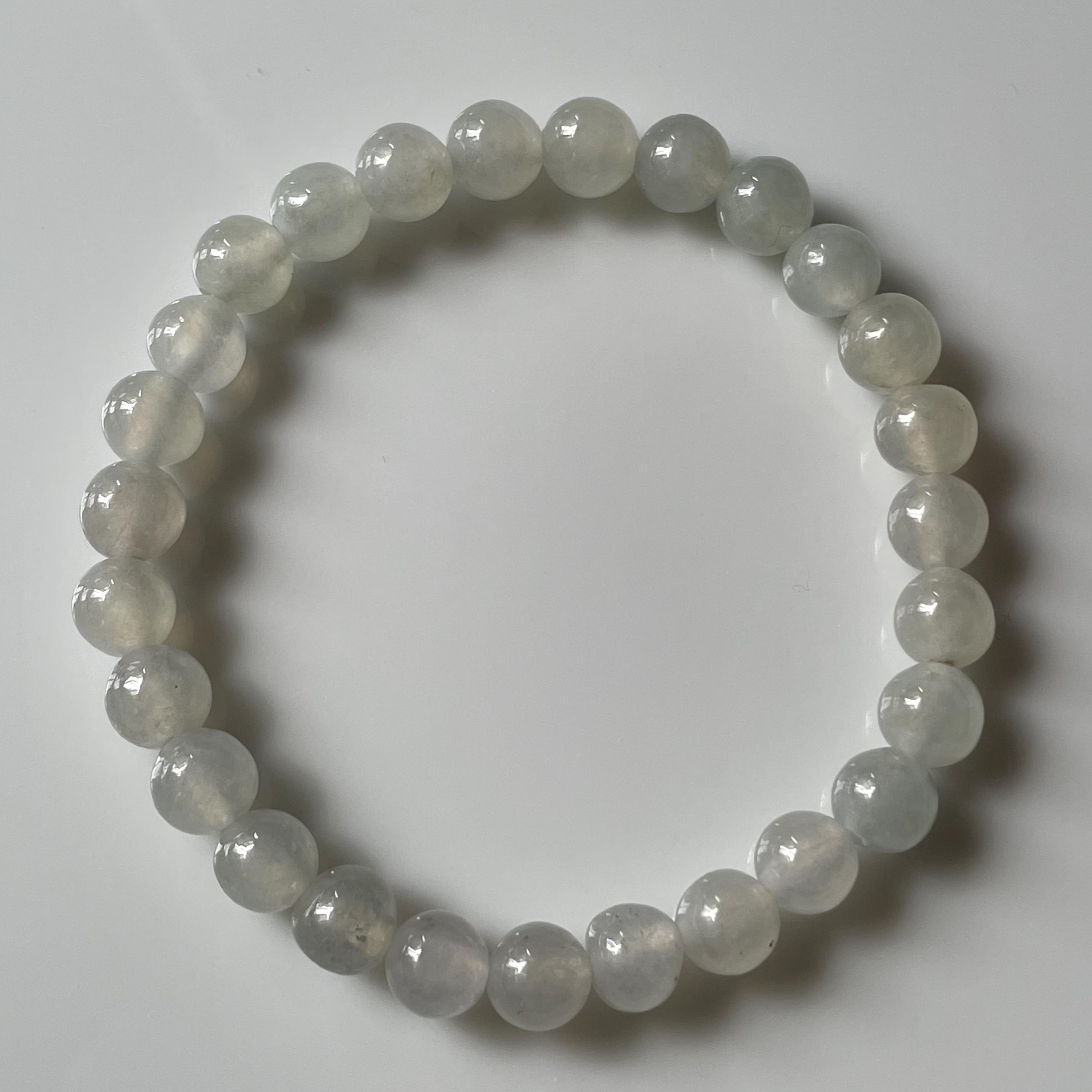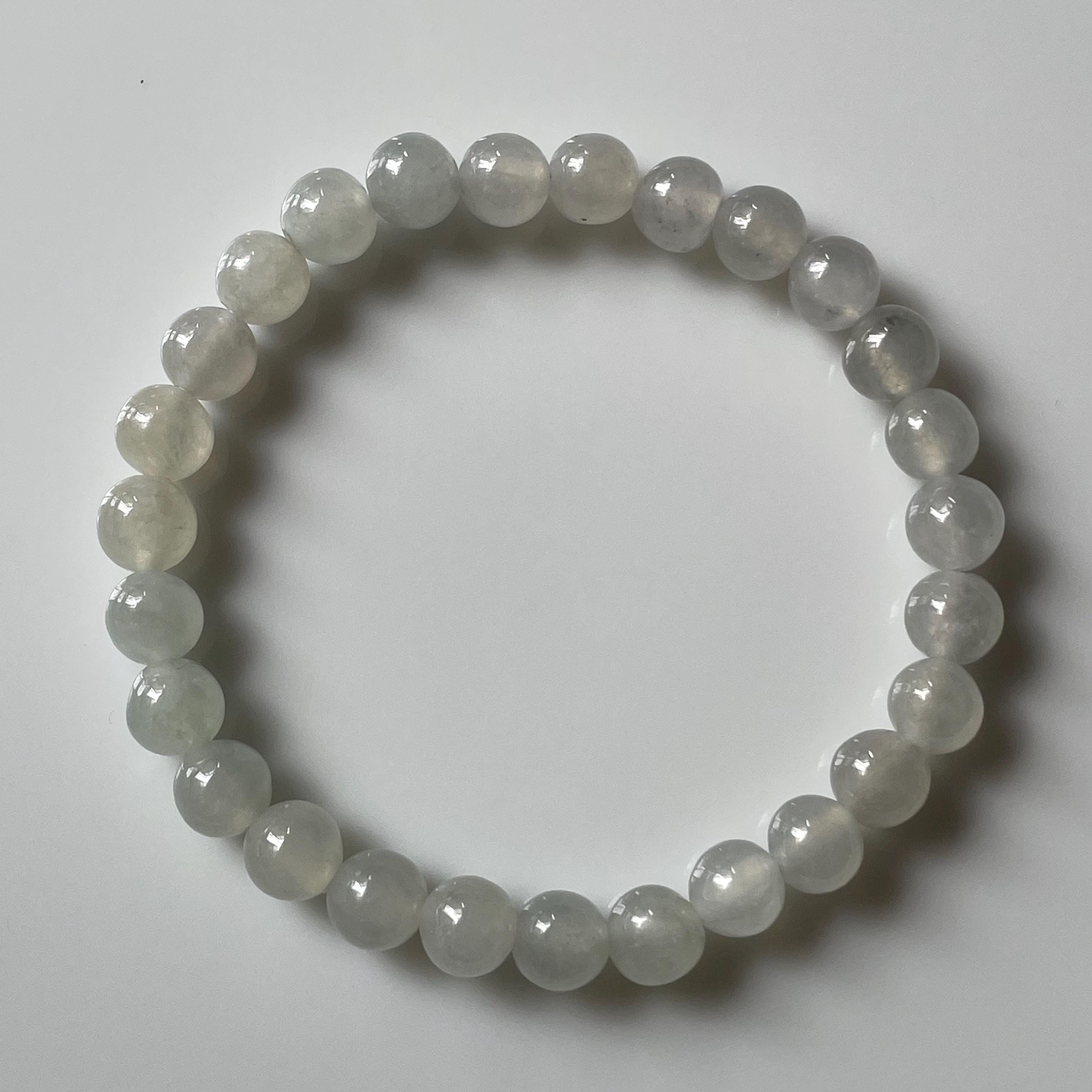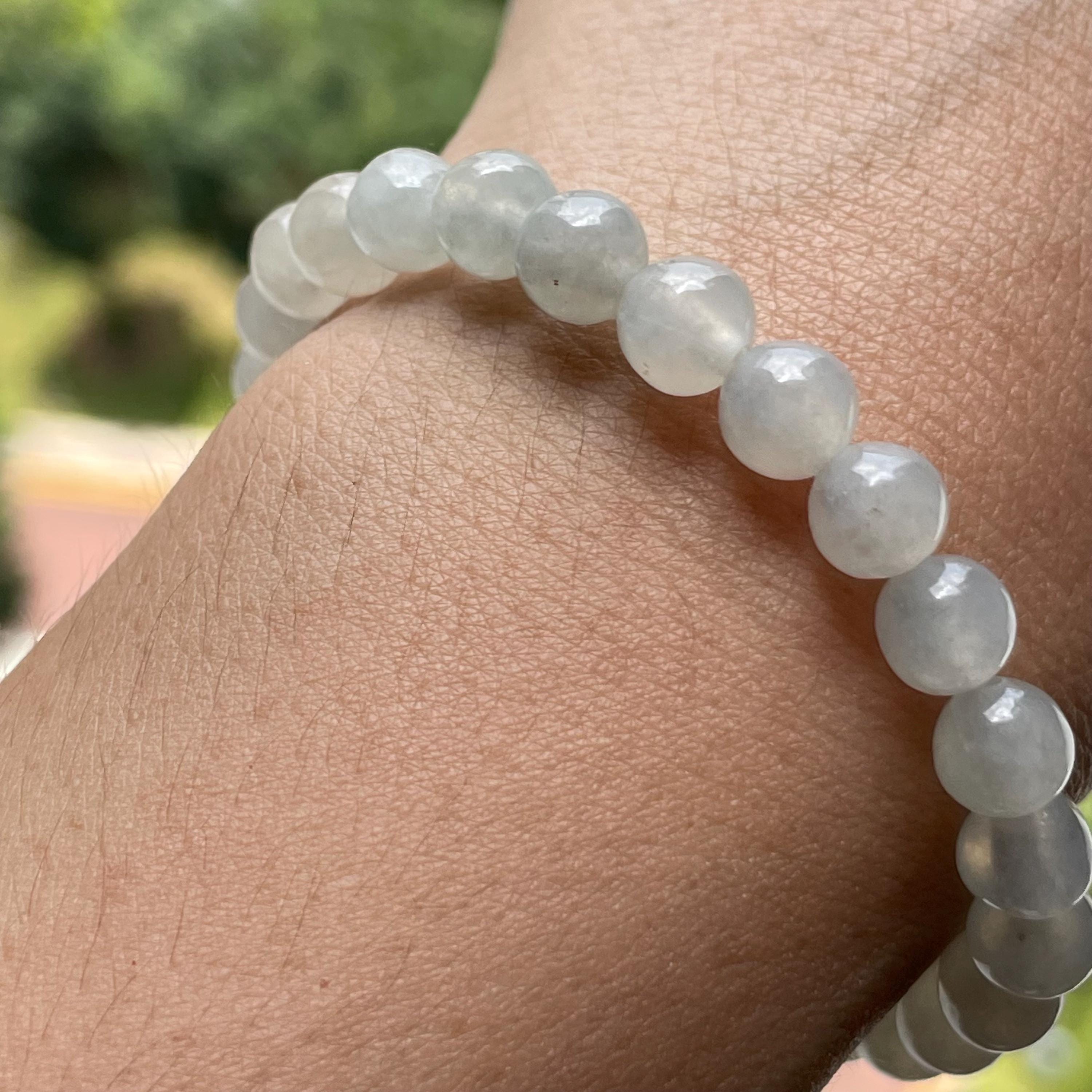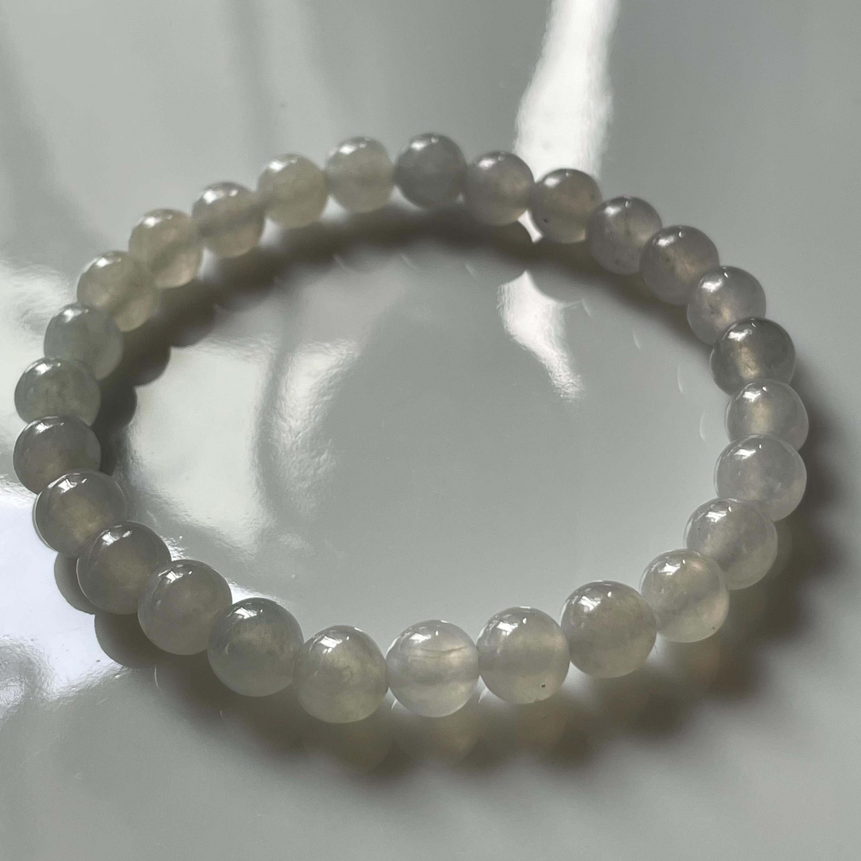 This Jadeite Jade Bead Bracelet is Free of Treatment from Artificial coloring/bleaching/chemical infilling. It occupies natural white color/ colorless with high translucency and vitreous luster. 27 pieces of round jade beads are threaded on elastic string.