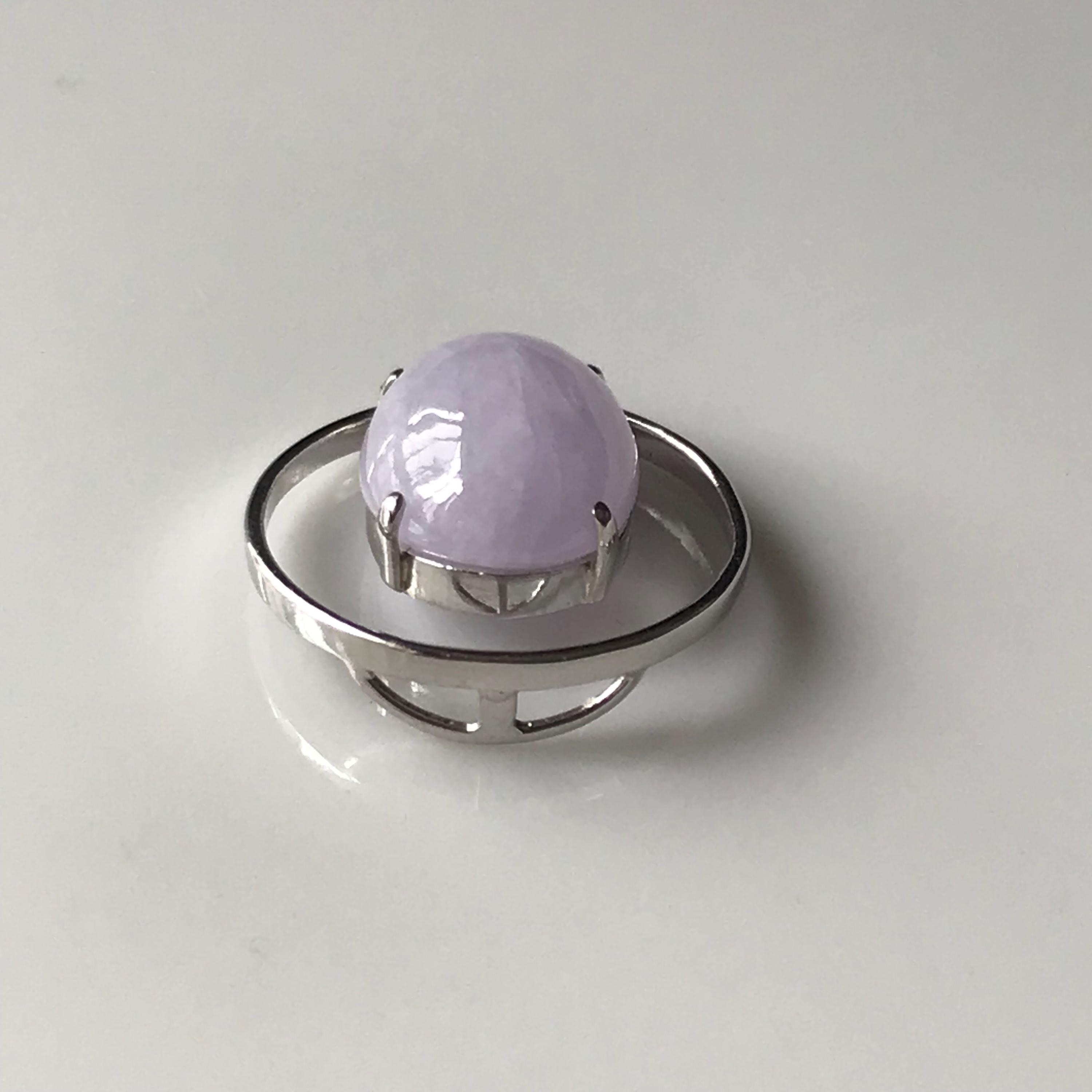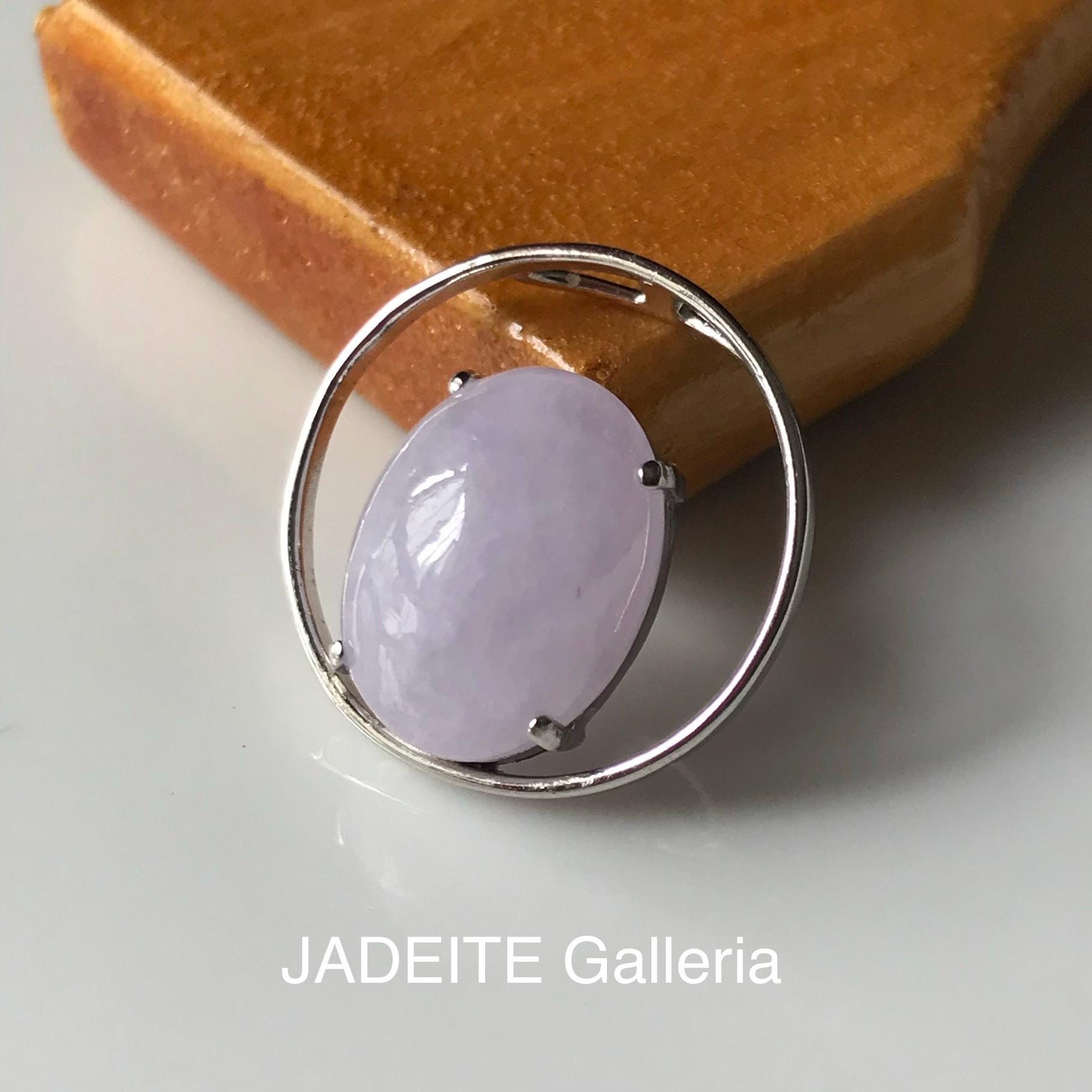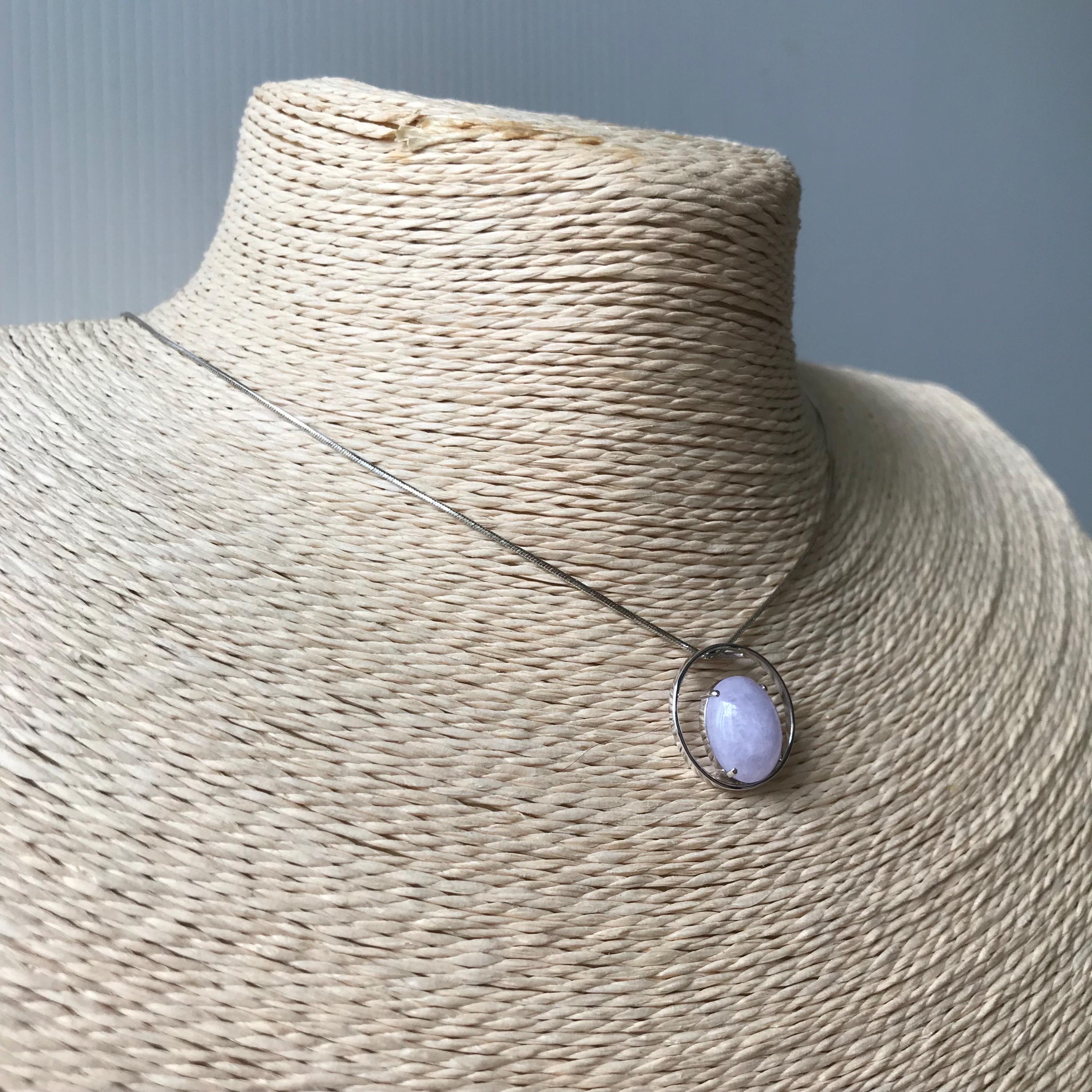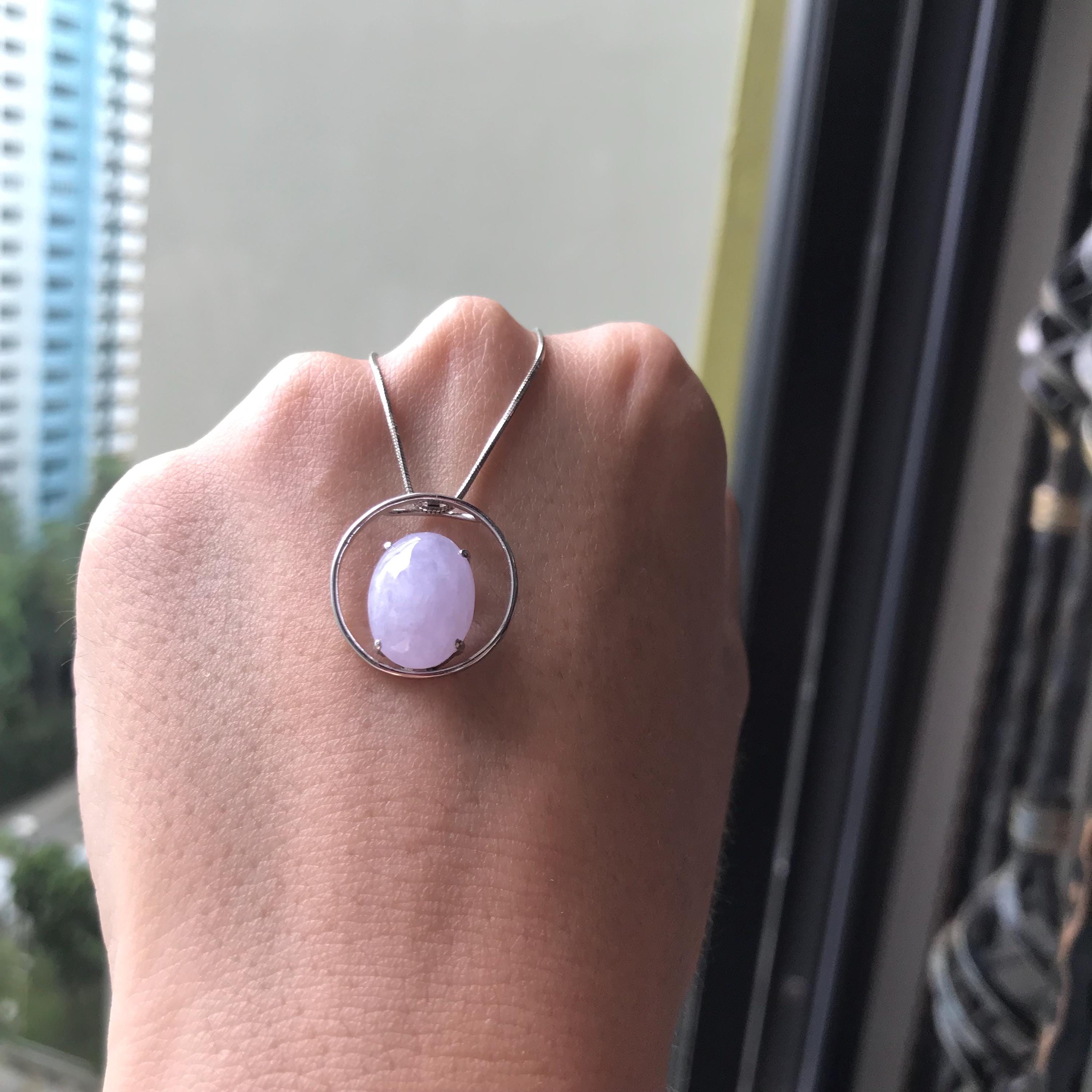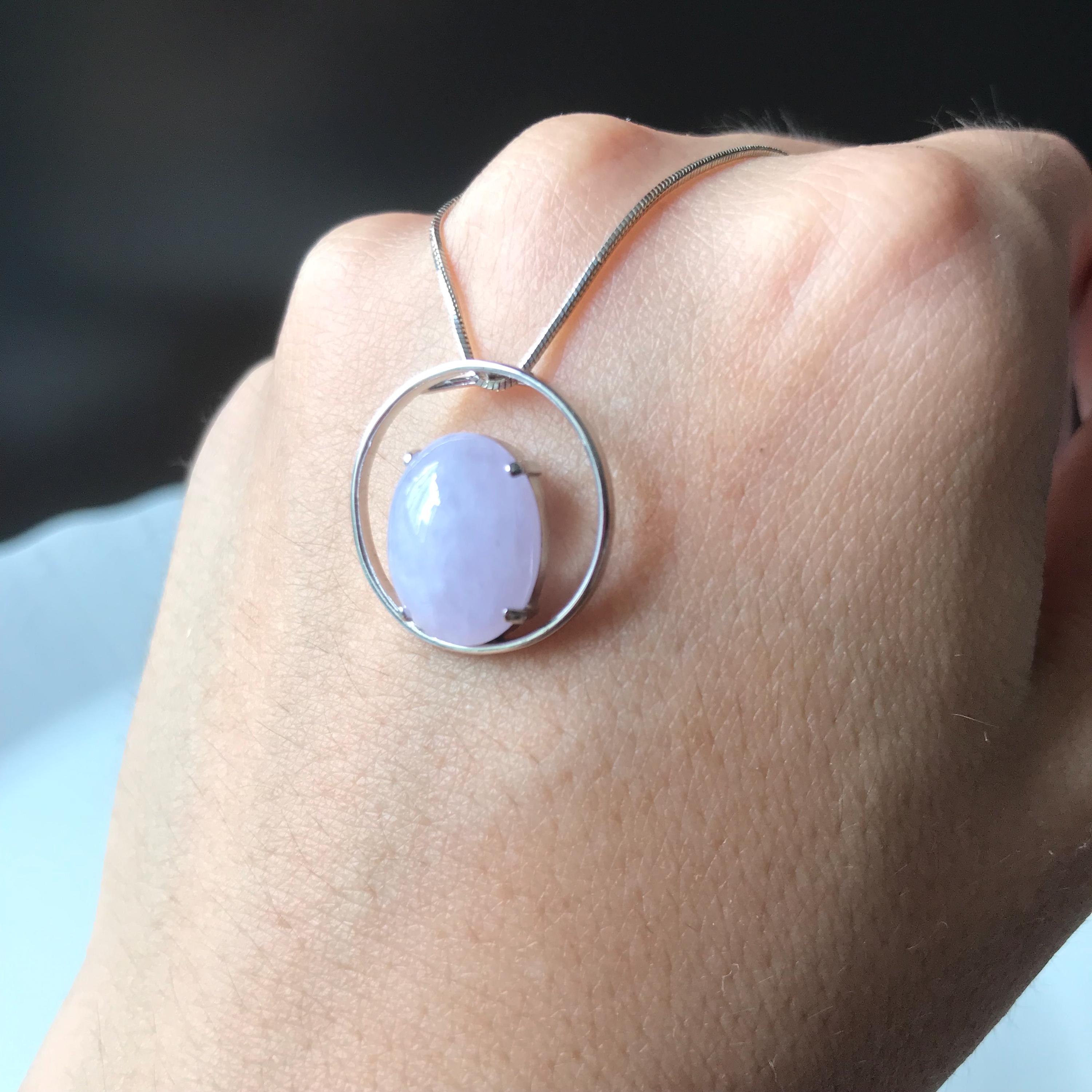 β’ This jadeite jade cabochon is made with 100% natural Type A jadeite jade, which is untreated, undyed and unheated but purely natural and 100% handmade. The color is faint lavender (yam color) which nowadays is a favorite color of most jade lover. This beautiful jadeite cabochon is set in 18K white gold as a pendant for ready wear.